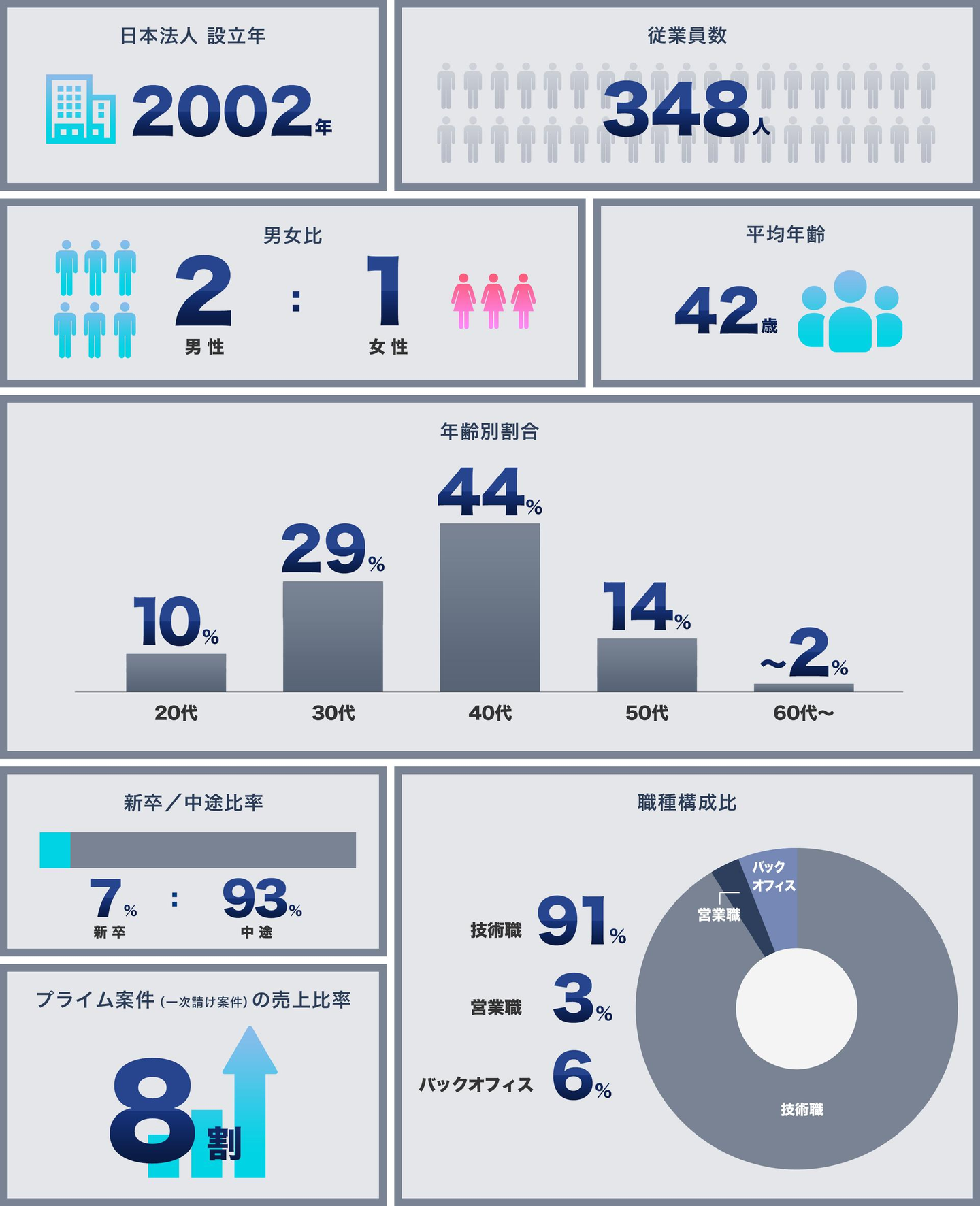 売上構成の8割がプライム案件(一次請け案件)のため、長期的かつ安定的にキャリアを形成することが可能です。40代をボリュームゾーンとして、20代から50代までの幅広い年齢層の社員が在籍。9割が中途社員で構成されているため、中途入社社員へのサポート体制は万全です。