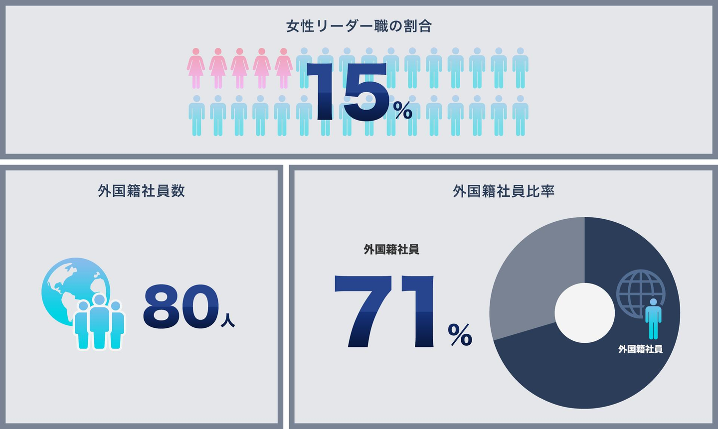プロジェクトの上流工程から携わることの多いGienTechでは、男女問わず、責任あるポジションで活躍する社員が多く在籍しています。育休取得後にプロジェクトマネージャーとして活躍し、管理職へ昇進する女性社員もいるなど、女性の登用も活発です。また社内の共用語は日本語ですが、社員の国籍は10ヶ国以上。ダイバーシティかつグローバルな環境で働くことが可能です。