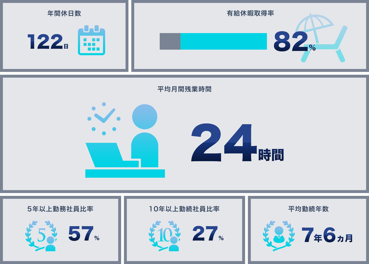 有給休暇取得率は82%、平均月間残業時間は24時間と、ワークライフバランスの整った環境です。社員の4人に一人は10年以上在籍しています。プライベートや子育ての時間も確保しながら、キャリアアップを目指せる環境です。