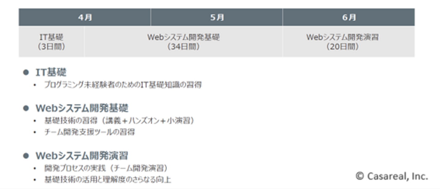 プログラミング未経験者であっても、「JavaScript/Javaの基本的なプログラミング」「フレームワークを用いたWebアプリの開発」「開発ツールを用いたチーム開発経験」「アジャイル版の開発演習」の研修を経て、実際にアプリケーションの開発を行い、学習方法を自ら習得できるレベルにまで成長できるプログラムです。