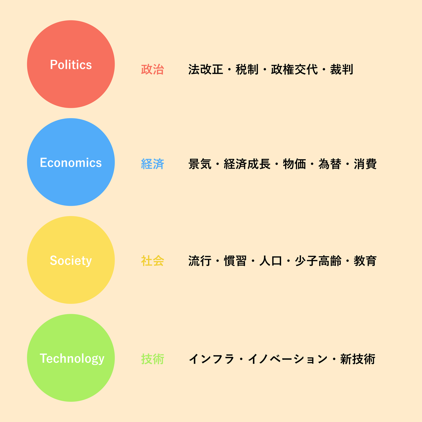 以下の4つがPEST分析のフレームワークである。