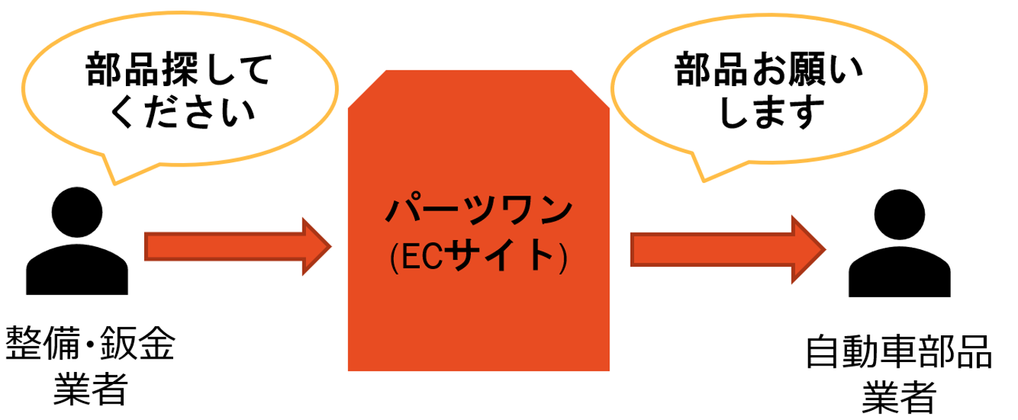 簡単に一例を言うと、車の整備や修理をする鈑金業者の方が部品を発注します。その時に、その部品を探し、発注をお願いするためのサイトを作成・運営しているのがパーツワンです。このようなサイトをECサイトといいます。(Amazonをイメージしてください。)