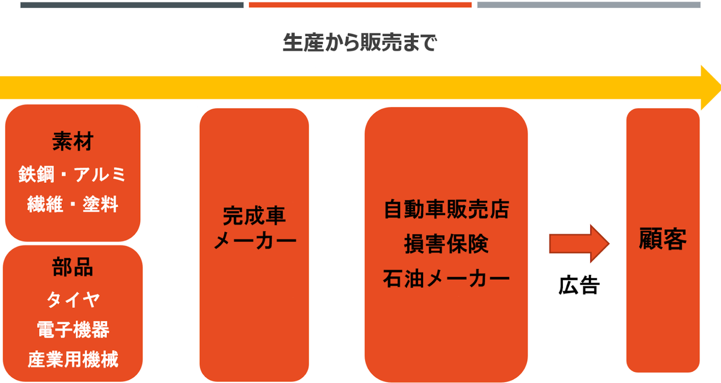 上記の生産から販売までのフローはとても大まかなものですが、自動車を作るまでに沢山の素材や部品が必要で、それを組み立てて初めて店頭に並ぶというイメージは分かるかと思います。そして、もちろんお客様の手に渡る前には保険や物流等も関わりますし、広告を打ったりもしますね…皆さんの手元に届くまでにとてつもなく多くの企業が関わっているわけです。
