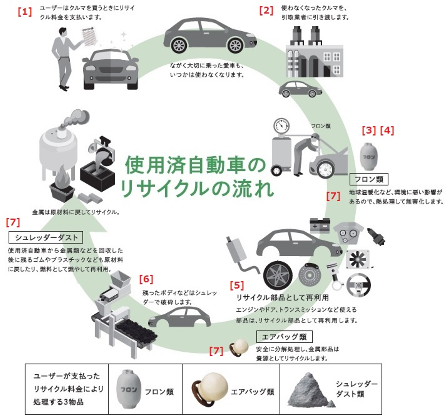 上記の図を見るとわかるように、使用済みとなり寿命を終えた自動車たちは、引き取り業者へ渡し、自動車のフロン類やリサイクルできる部品、金属等に分けていきます。