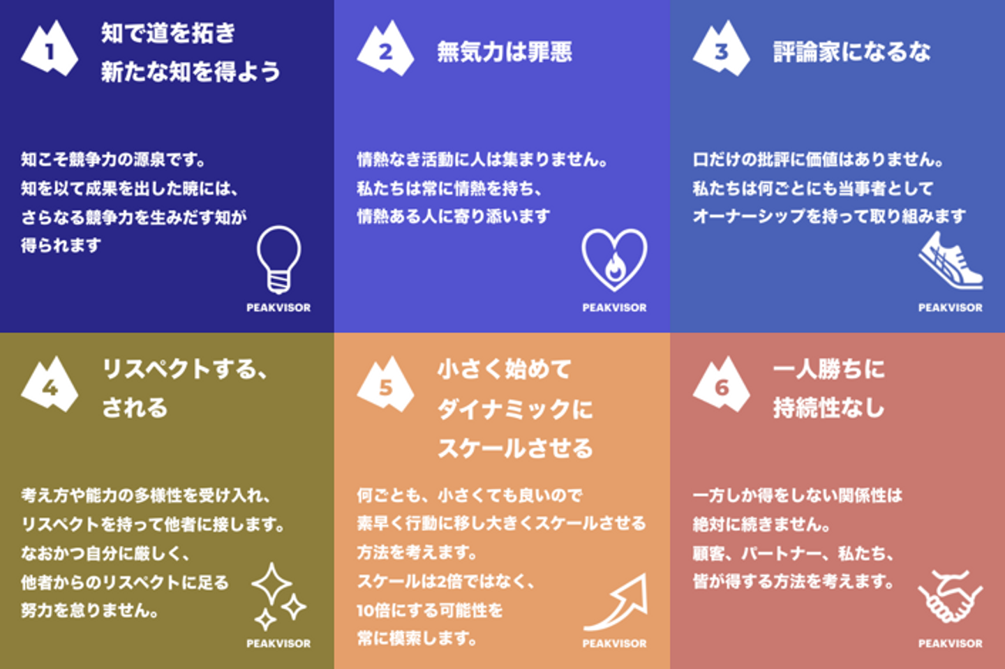 このValueは「PeakVisorが何を大事にして、どんな行動を良しとしているか」を示すものです。全員が同じ方向で仕事するための“コンパス”のような役割です。