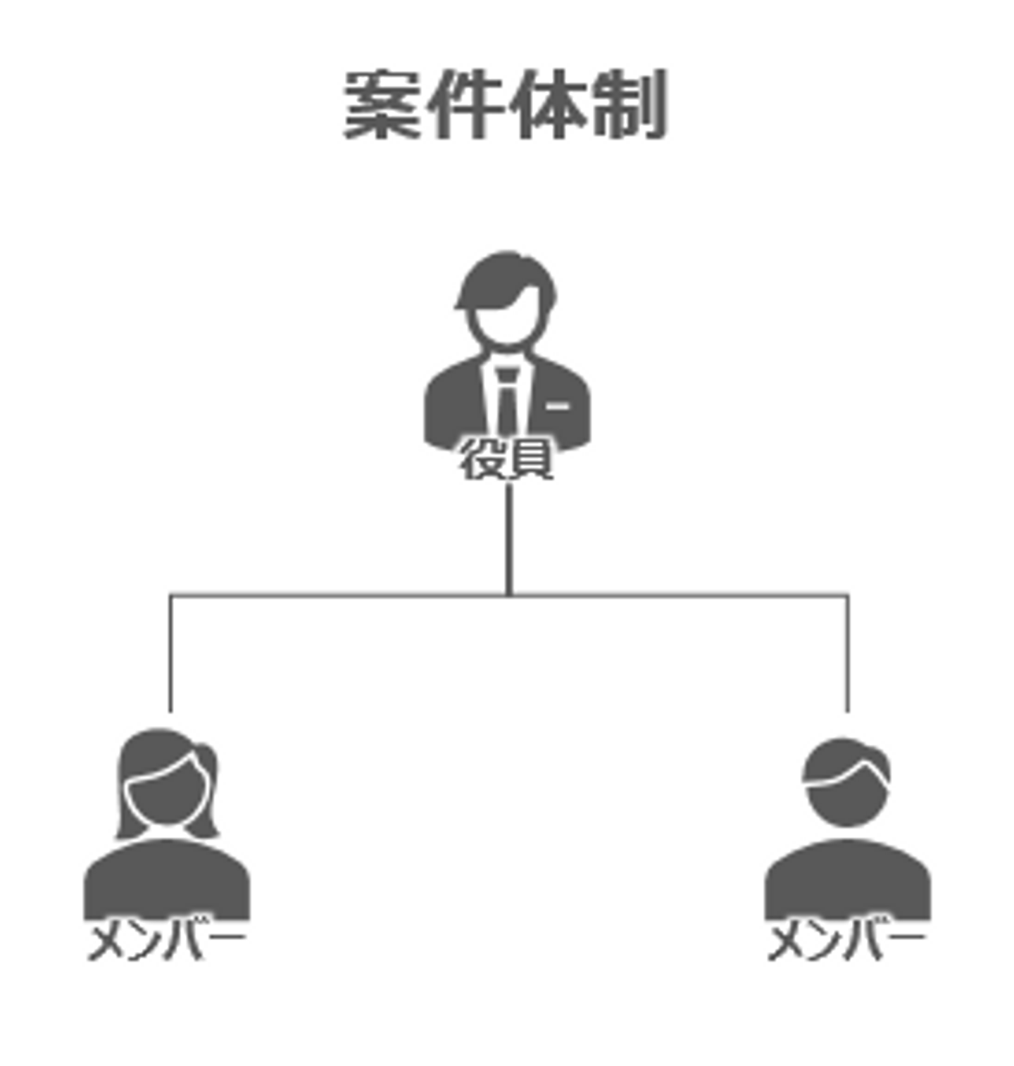 役員1人、メンバー2人だったり、役員1人メンバー1人、役員2人メンバー2人だったりと案件によって人数は変わりますし稼働率も変わりますが、基本メンバー1人だけで案件に入ることはないので安心してください!