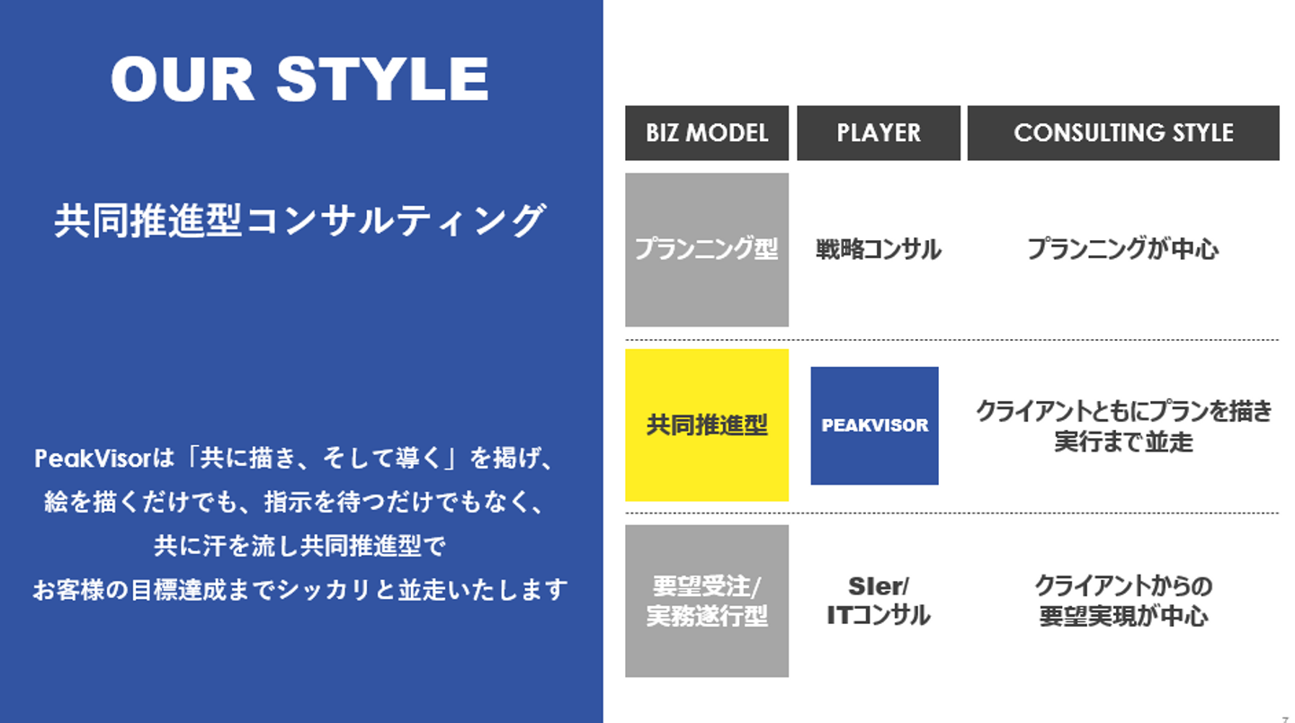 PeakVisorのコンサルティングスタイルは、共同推進型という言葉を使っています。共同推進型は「指針を示すだけでなく、指針に沿って目指す姿の達成まで一緒に走り切る」ということをイメージしています。