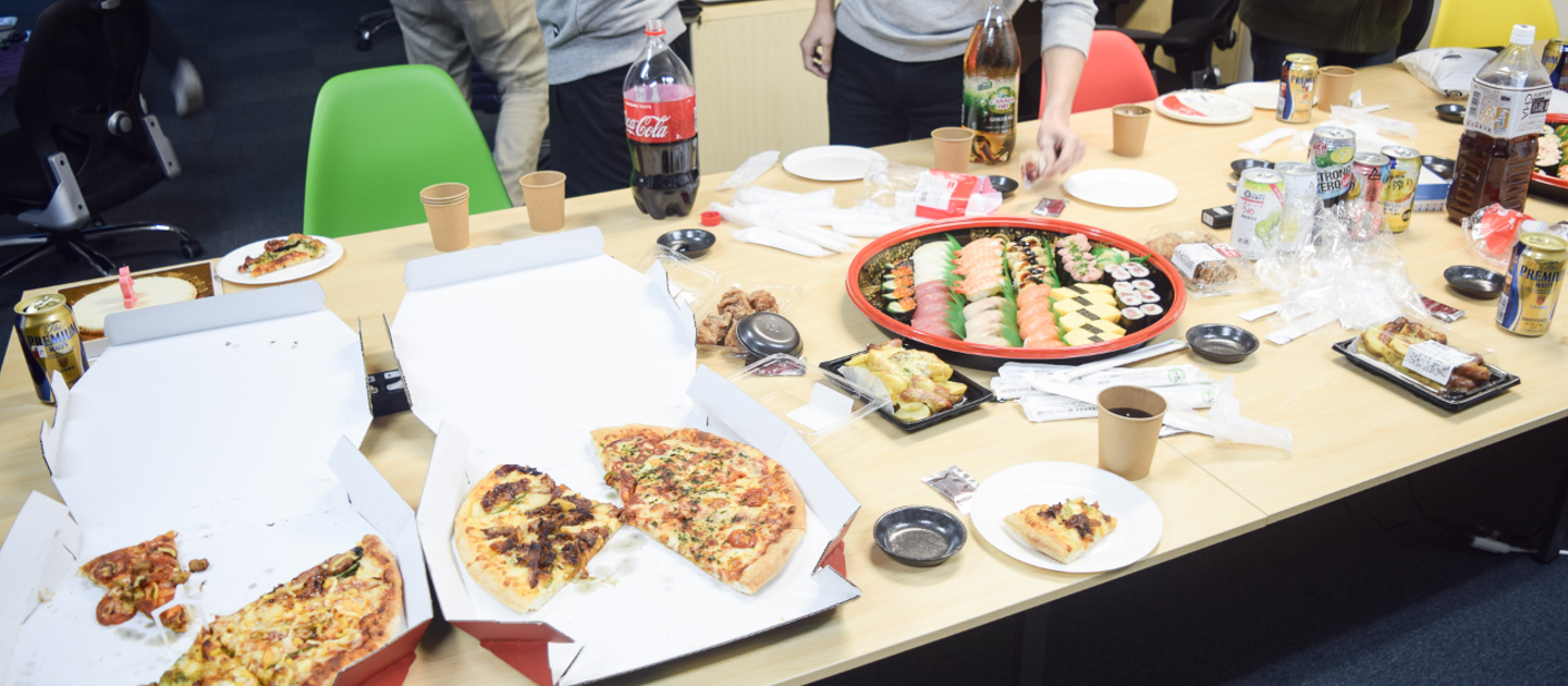 KPIを達成したり、めでたいことがあると、全員でさらに意欲を高めるためにピザ・お寿司パーティーを開催します。楽しいパーティーを通して、メンバーの意思疎通やざっくばらんに話せる機会を作ります。