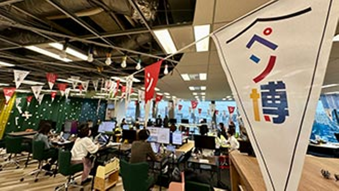 ペン博オリジナルデザインの旗を準備。スタッフみんなで飾りつけを行い、オフィスをお祭り仕様にチェンジします。FVは、ちょうどみんなで飾りつけを行なっている時の写真です!