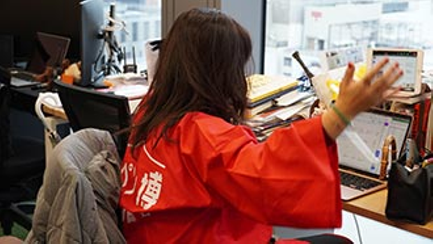 オフィス内、テレビ会議、クライアント訪問、と至るところにはっぴ姿で登場します。