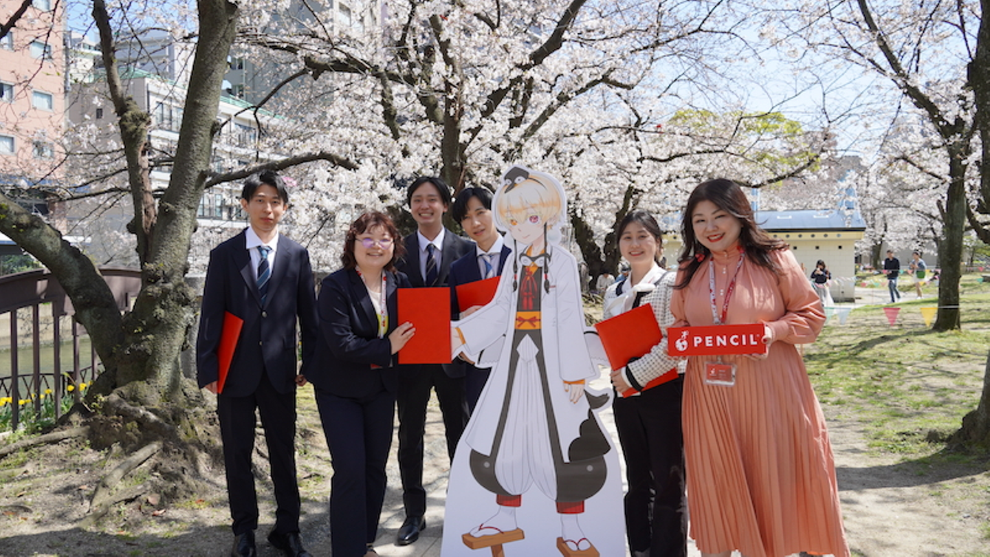 長期インターンでペンシルの業務に挑戦してみた人、秋卒業でひと足先に入社していた人もいましたが、初めて同期全員が揃ったスタートの1日!雲一つない青空と満開の桜が、彼らの門出を祝っているようでした。今年はペンシル初のAI社員「ペンタ」も入社し、記念写真もひと味違ったものになりました。