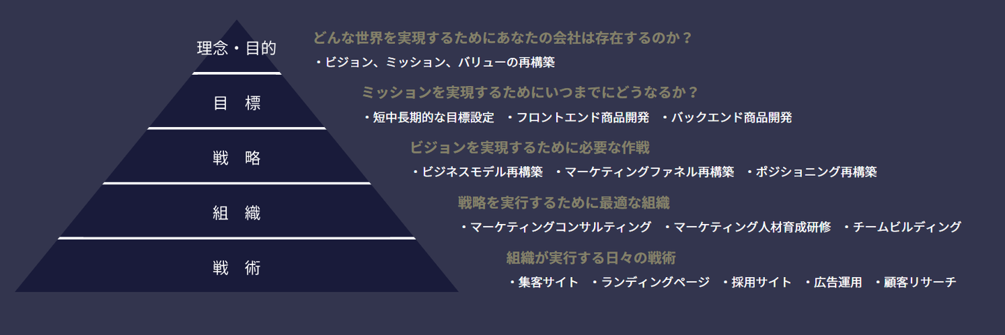 元々はWeb制作会社としてスタートした当社ですが、現在はマーケティング戦略の構築からコーチングまで、幅広くご支援を行っています。クライアントさまのビジネス課題を本質的に解決するためには、企業理念やビジネスモデル、人材育成にまでより広くサポートさせていただく必要があるため、自然とそのような形になりました。