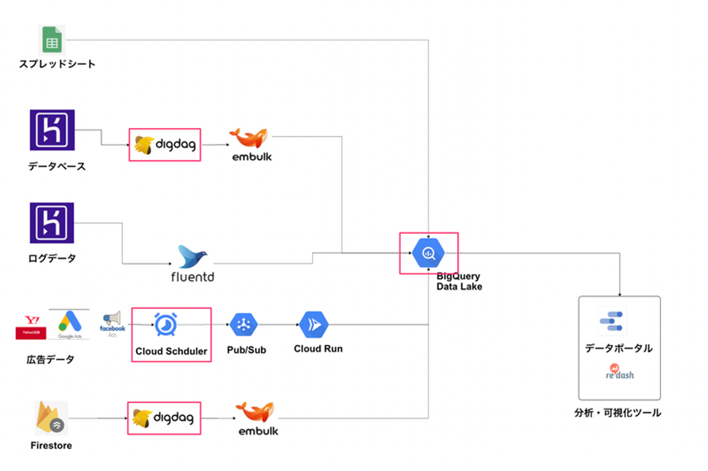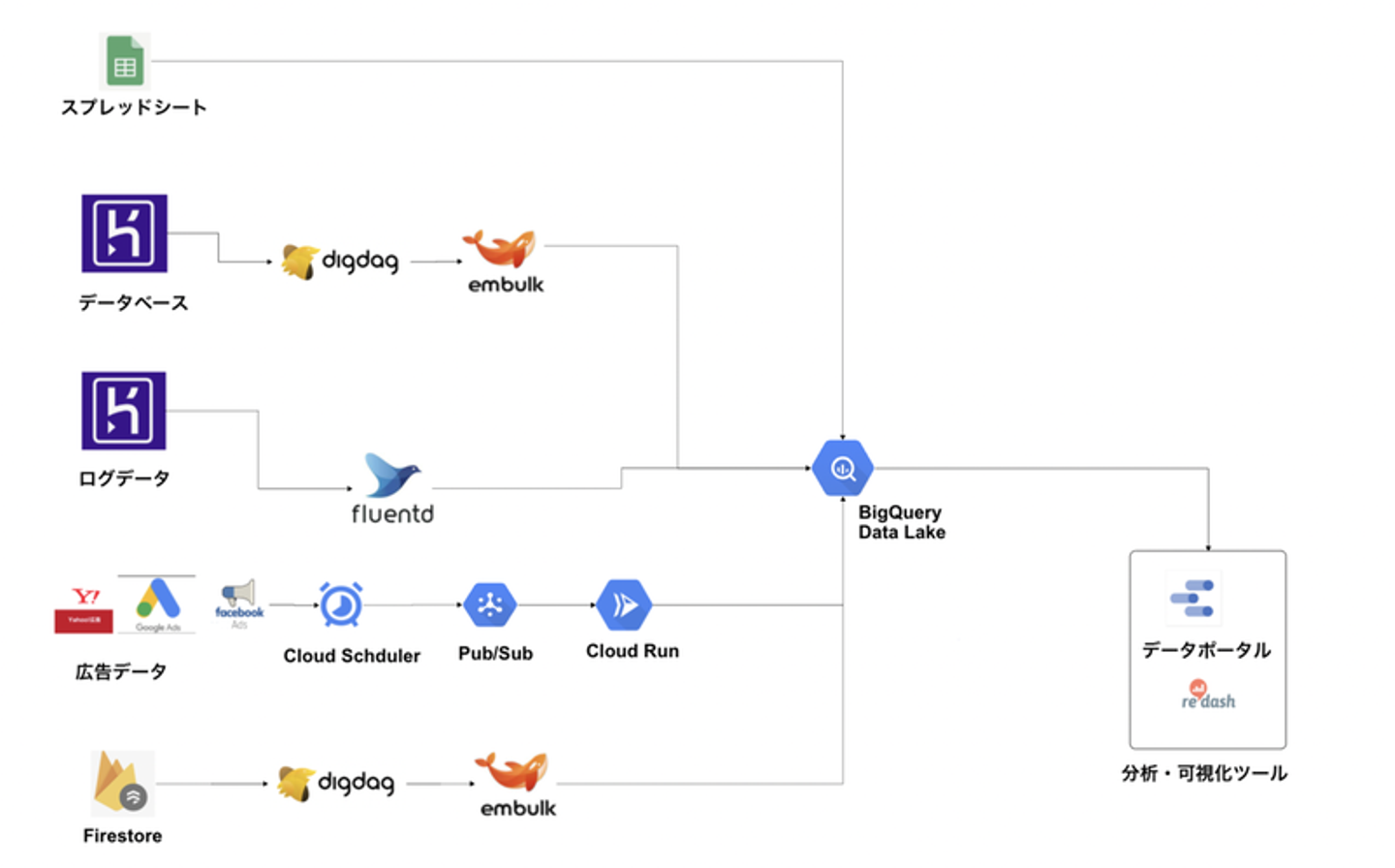 ログデータはHerokuのログドレインを使ってsyslogの内容をfluentdを経由してBigQueryに転送するような構成で、データベースとFirestoreはDigdag+Embulkを用いて収集する想定でした。