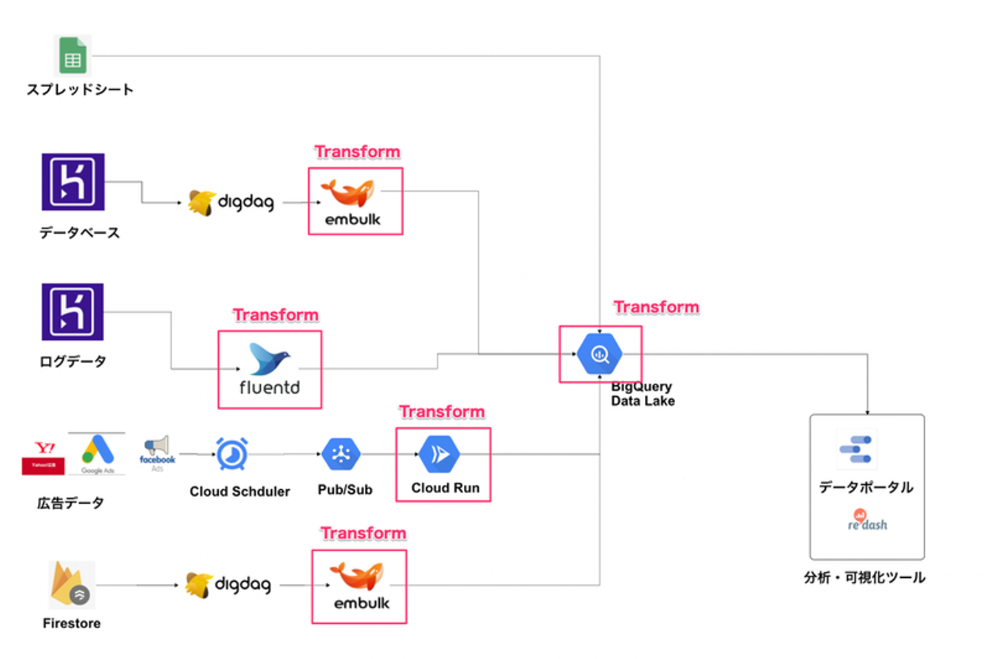 また今回のデータパイプラインはETLを想定していますが、データ変換処理 (Transform) を行うとすると、Embulk、Cloud Run (Nodeアプリ)、fluentd、スケジュールクエリの4つの異なる記法を覚えて、それぞれ処理を書かないといけなくなります。