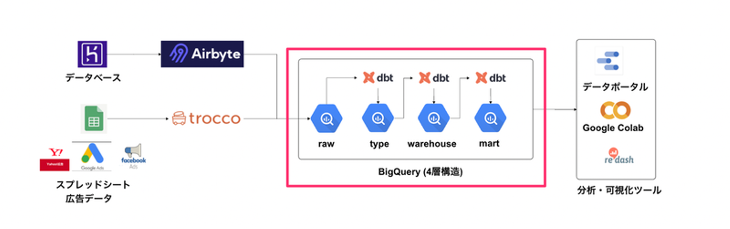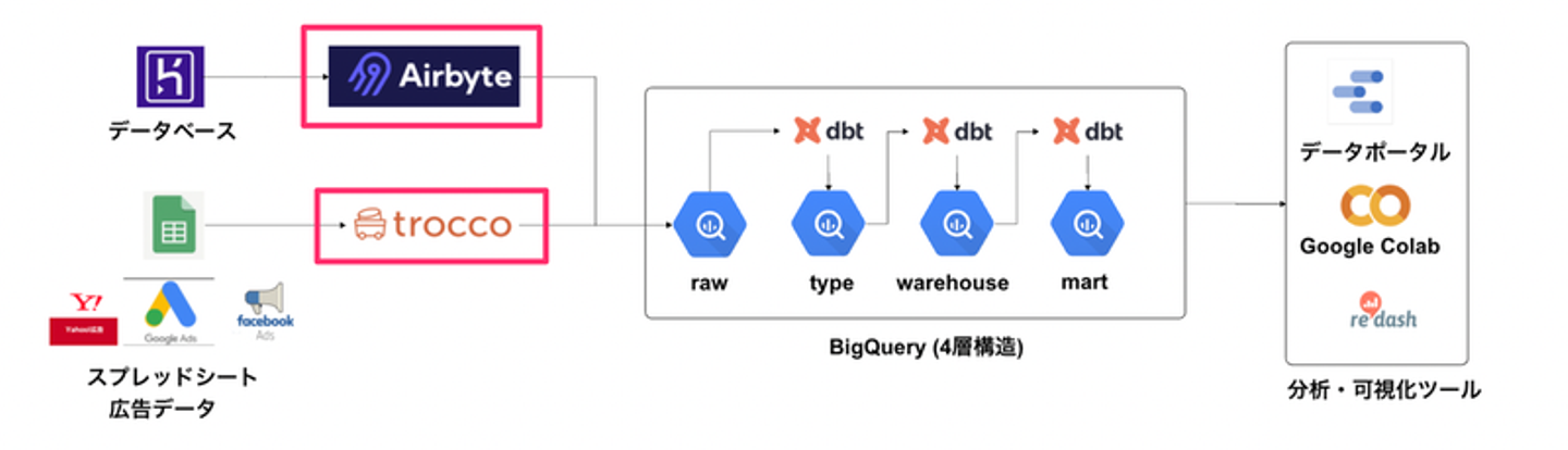 EL処理はAirbyteとtroccoで行い、T処理はdbtに役割分担をしています。
