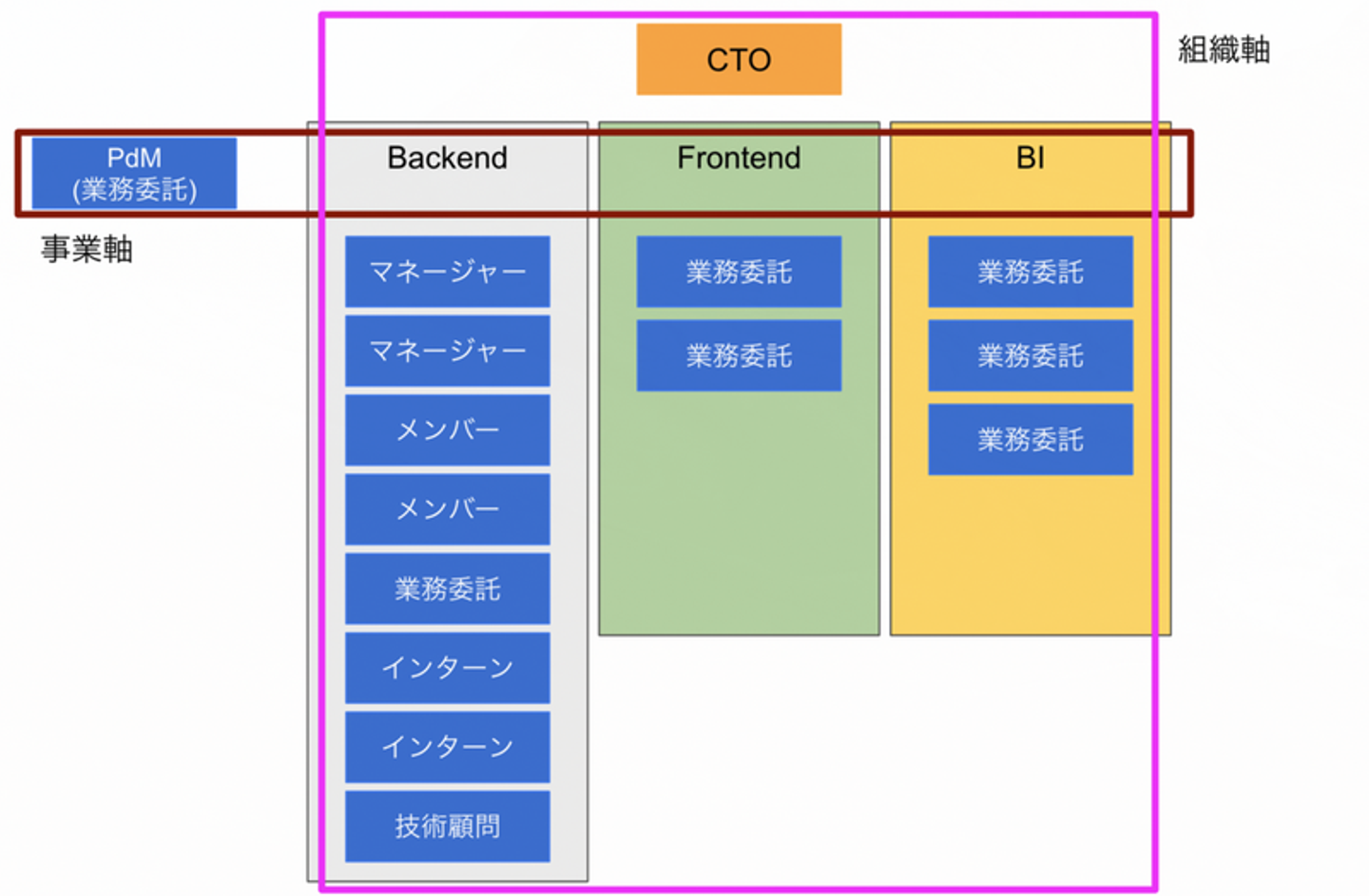 ザックリ説明すると組織としてはCTO管轄である「組織軸」と、PdM管轄である「事業軸」の2軸です。