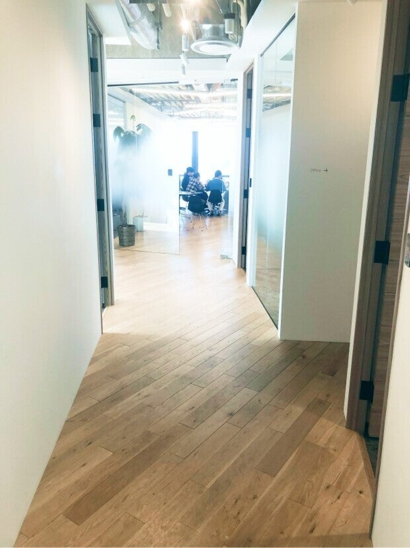 そして、エントランスを過ぎると、光溢れる会議室スペースが続きます。ガラス張りの会議室もあって、太陽を浴びながら打ち合わせしたりしてます。
