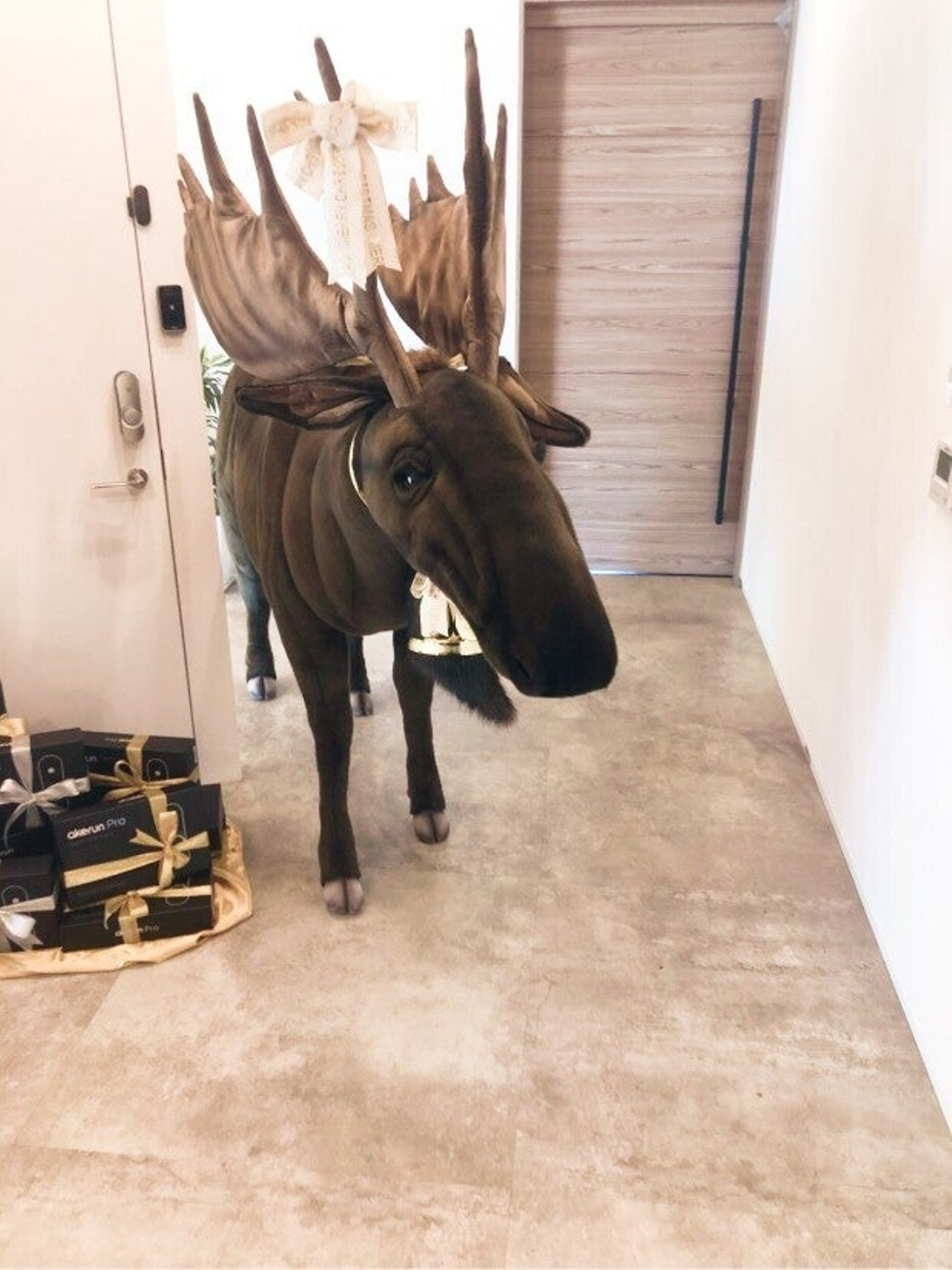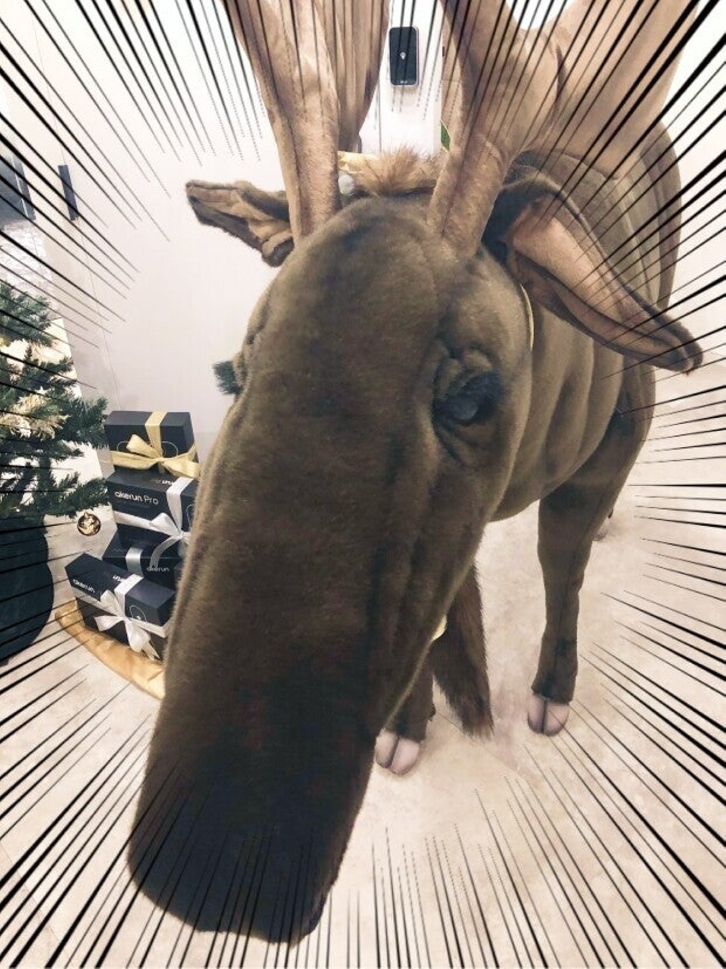 そう、ヘラジカですね。いつもこの場所でお客様や従業員を出迎えてくれるその名も”アントルン”です。初めて来社される方は大体頭をなでていくか、写真を撮っていきます。人気者ですね。