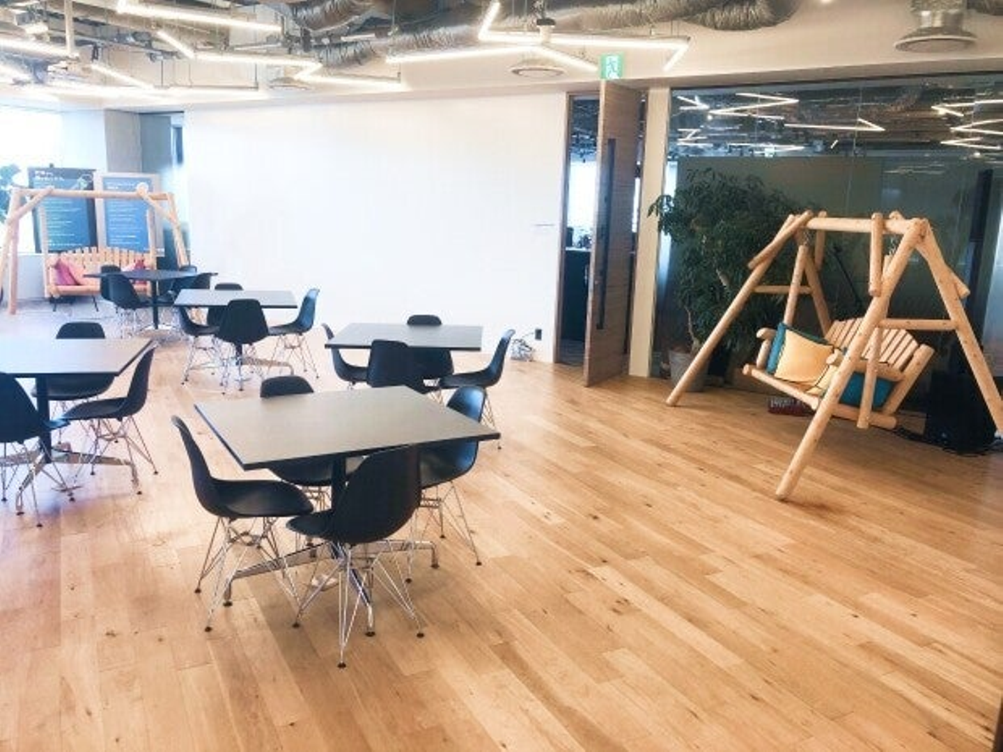 ここは従業員が簡単な打ち合わせやランチ/ティータイムを楽しんだり、来社されたお客様にリラックスいただいたり、そして大人数の社内/社外イベントなどに使用しています。