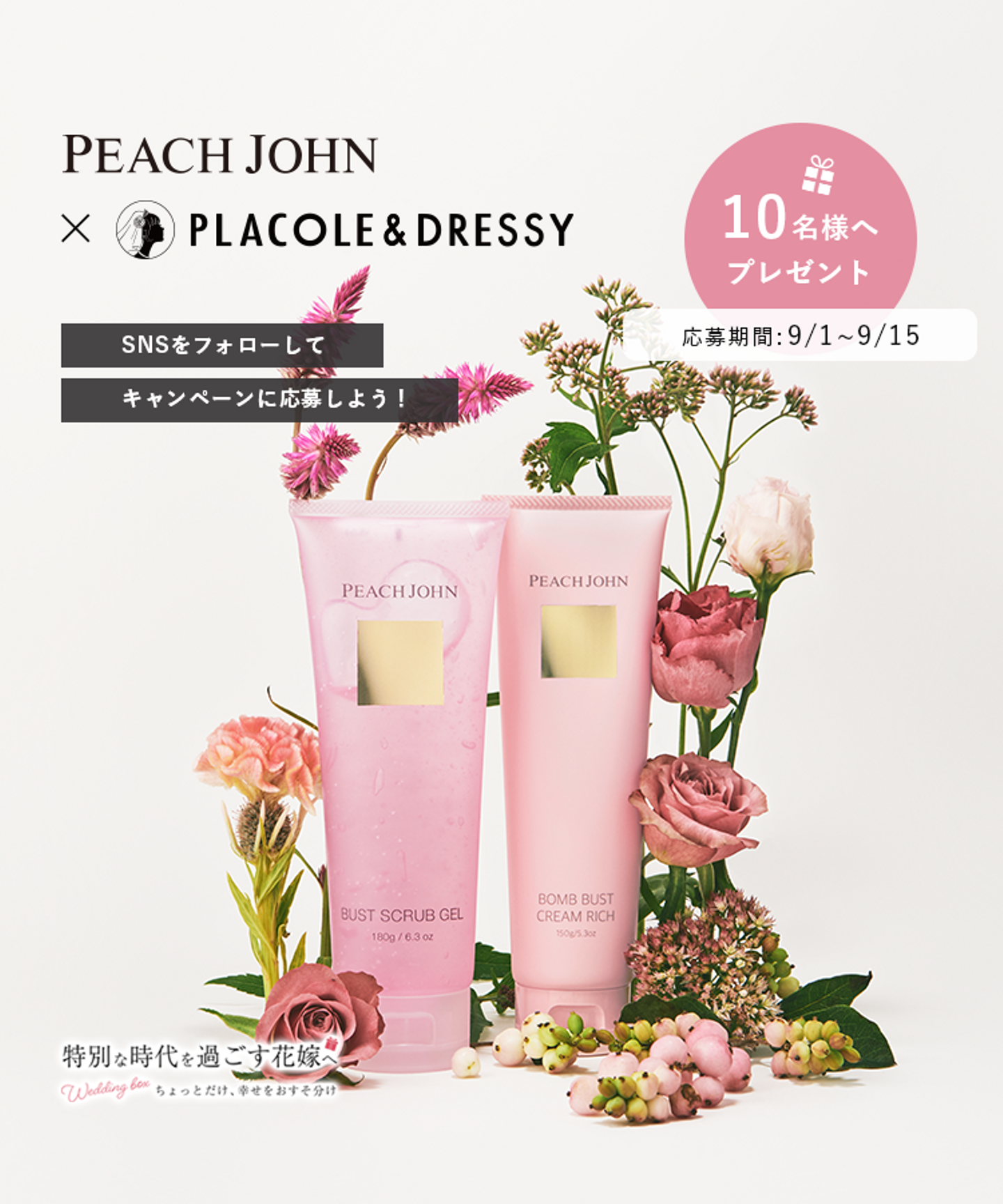 「特別な時代を過ごす花嫁へ」PEACH JOHN × PLACOLE&DRESSY がコラボ!PEACH JOHN BEAUTYの「バストケアセット」を10名様にプレゼント!