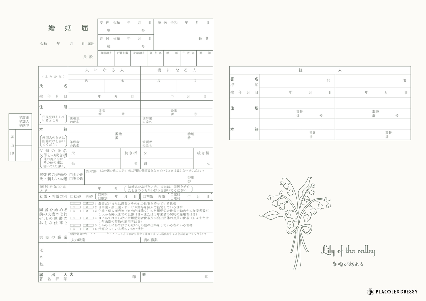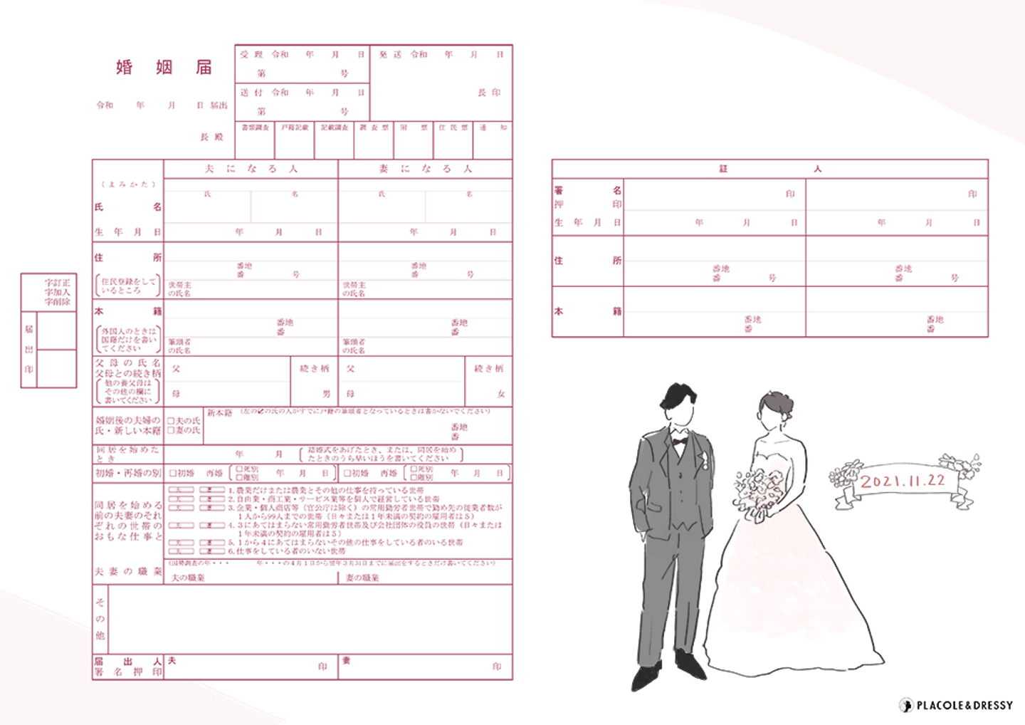 この季節に結婚する新郎新婦ならではのオリジナルデザインの婚姻届。11月22日はいい夫婦の日ということで、婚姻届を提出するカップルが大勢いるのではないでしょうか?そんないい夫婦の日ver 新郎新婦が並び、日付も入ったプラコレオリジナル婚姻届デザインを作りました。