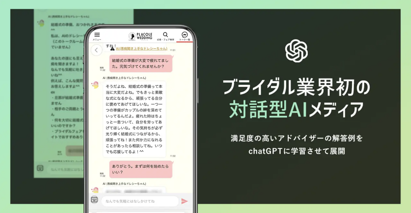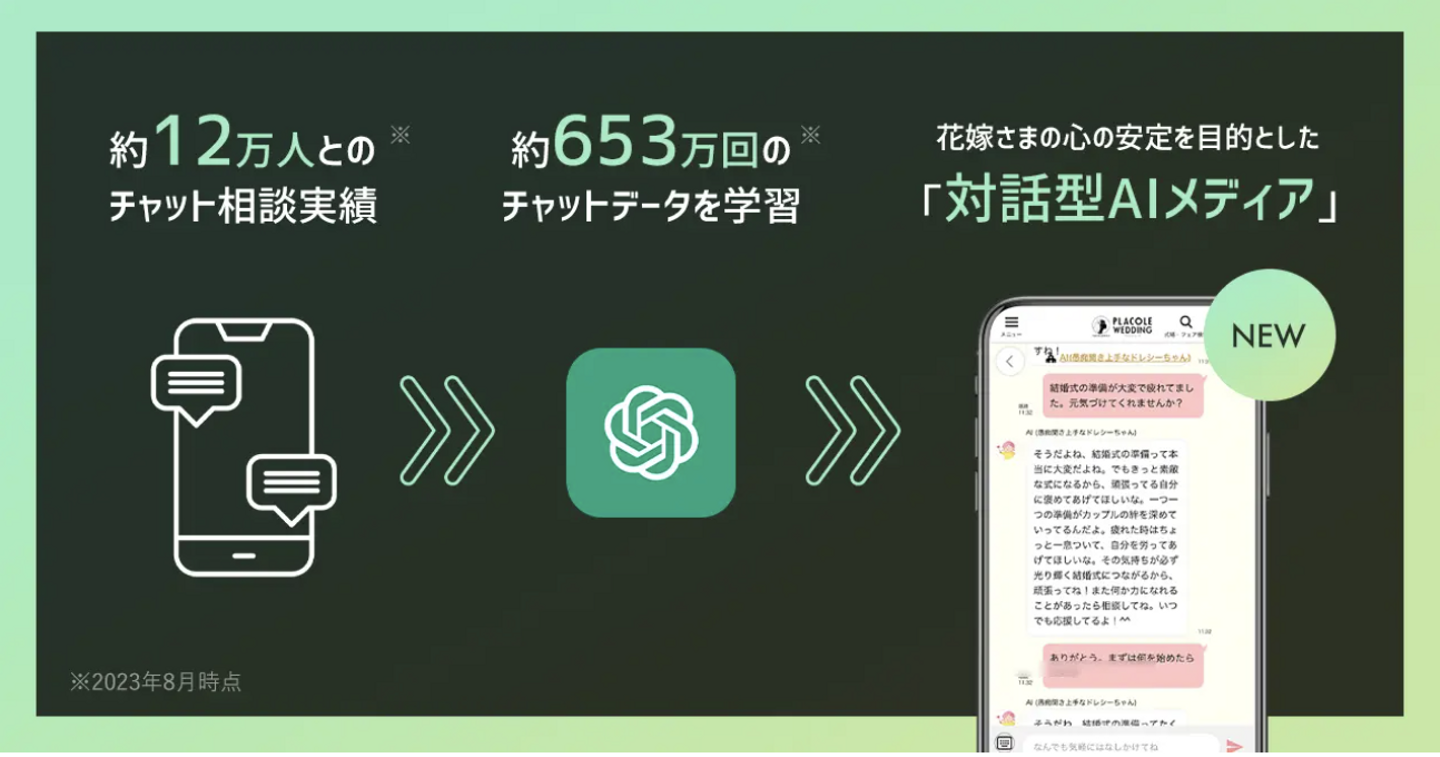 サービスリリースから8年目、対話型(チャットUI)の情報メディアにこだわり続けてきたプラコレが、 過去7年の4550万件分のチャット相談ノウハウを元に最新技術であるchatGPT(オープンAI)を用いて、 結婚式場の紹介だけでなく、カップルさまの親友や家族のような存在であるAI「愚痴聞き上手なドレシーちゃん」をリリース!