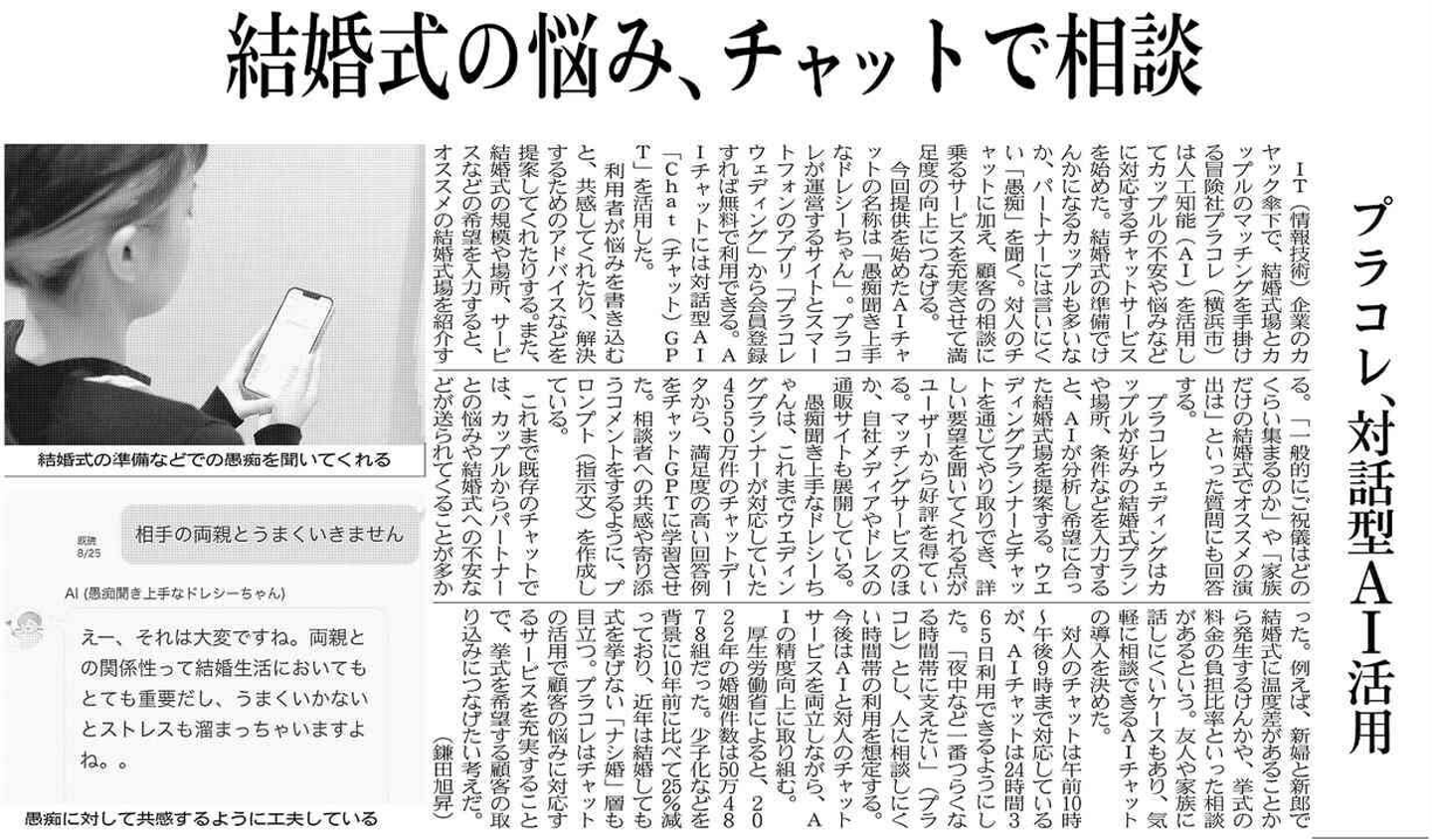 この度、PLACOLE WEDDINGの対話型AI「愚痴聞き上手なドレシーちゃん」が日経産業新聞取り上げられました!