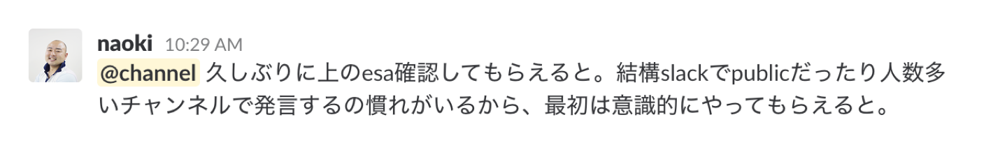 だから入社したら早いうちから、個人がPublicでの発言に慣れることや、新しく入った人が後から情報を追えることを前提に、フロー型の情報流通場所(今はSlackやWorkplace)とストック型の情報流通場所(esaやGithubなど)をうまく使い分けていく必要があります。