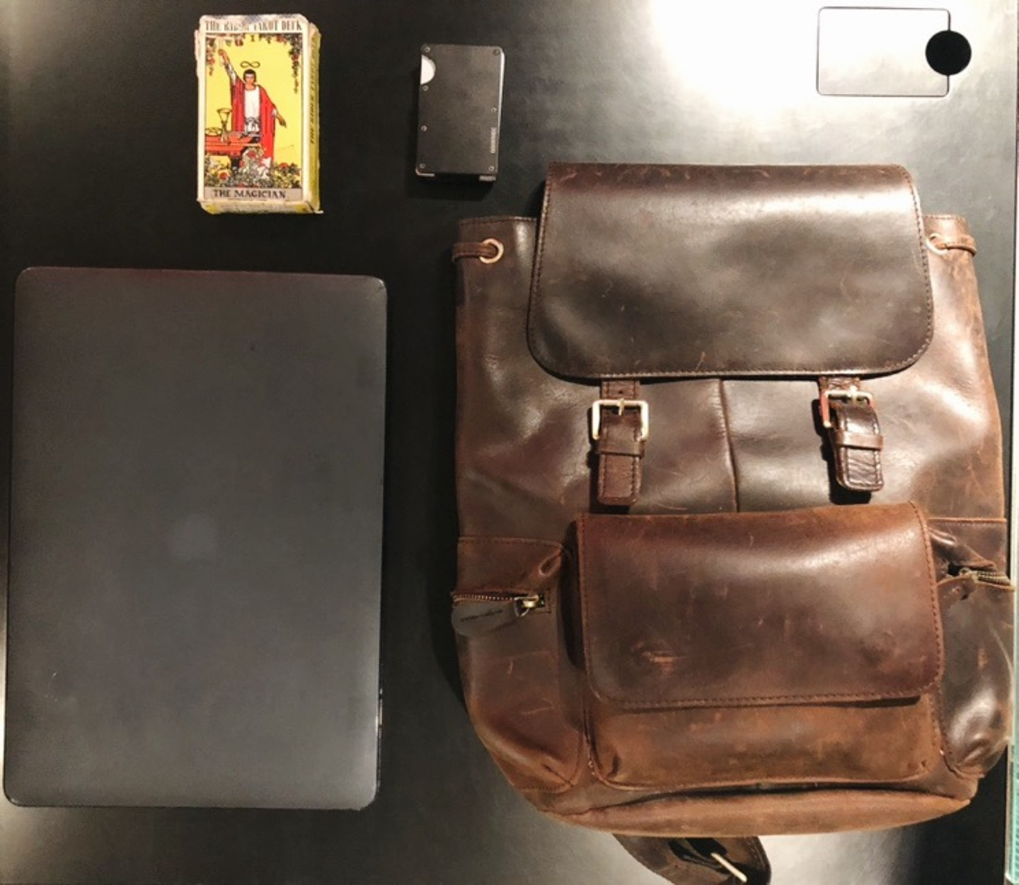 バッグの中身。普段から荷物はPCと財布程度しか入れていないそう。左上のカラフルな箱はタロットカード。タロット占いもmバーで働いていた時にマスターしたんだとか。