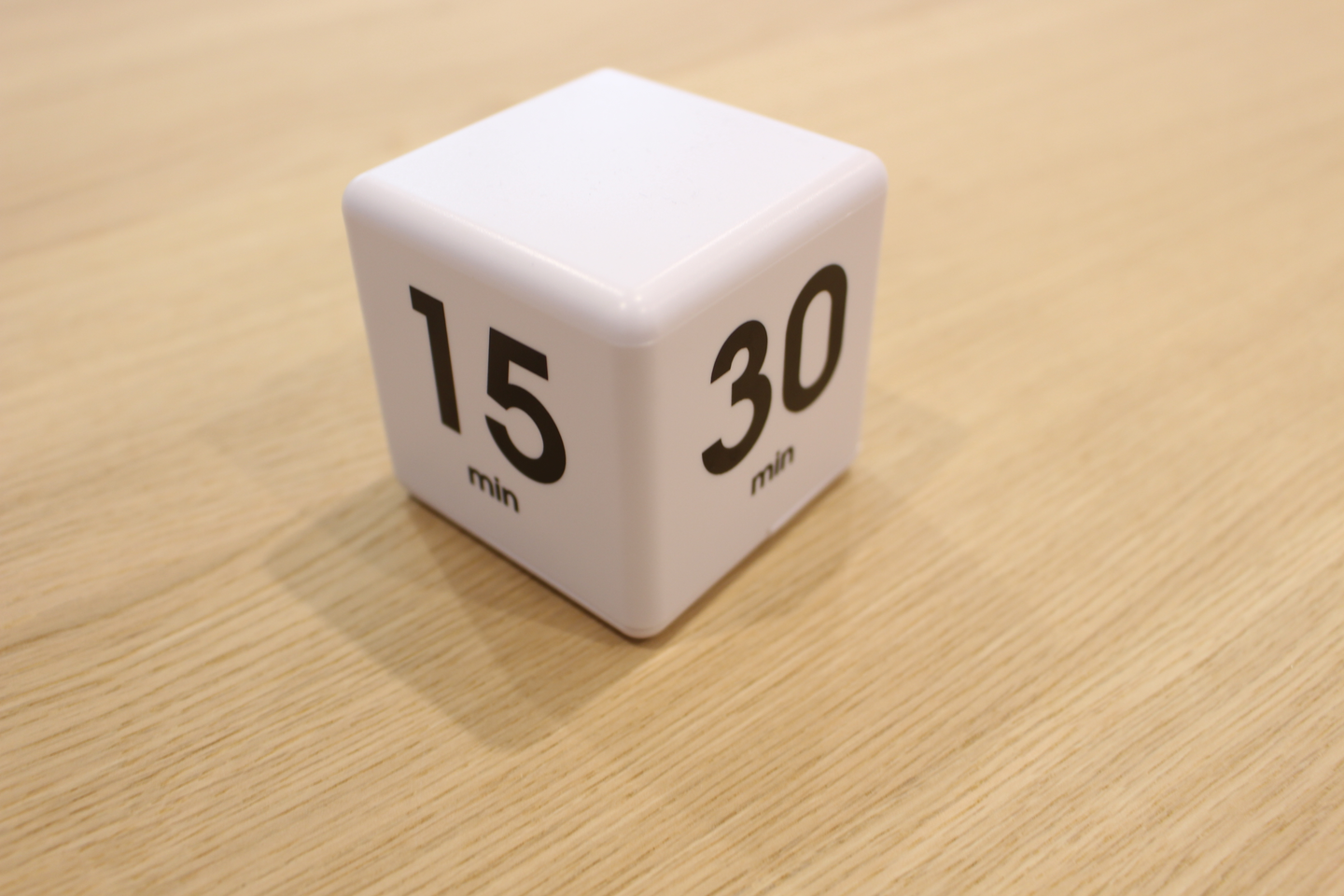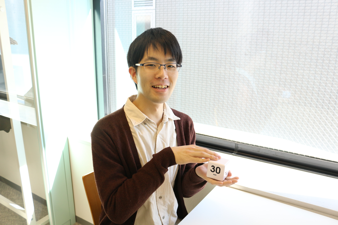 一瞬なにかわからないこのキューブ状の物体。実はこれタイマーなんです! 側面に書かれている数字が設定できる時間。計りたい時間の面を上に向けて置くことで、機械が角度を察知し自動的にカウントを始めてくれます。時間を意識して打ち合わせなどができるので、作業効率も上がっています。