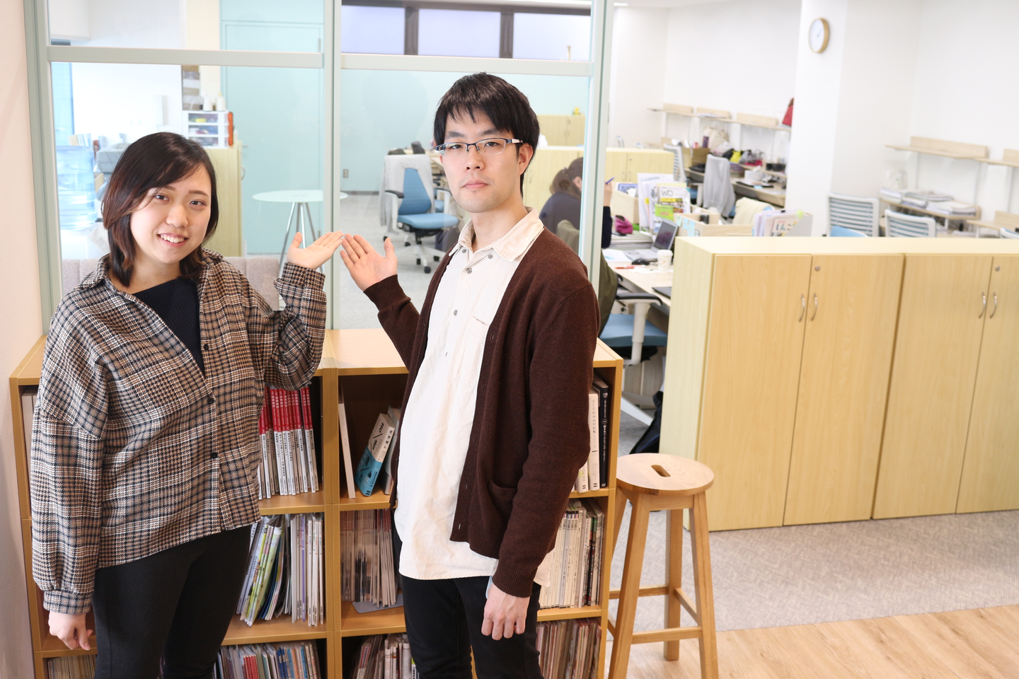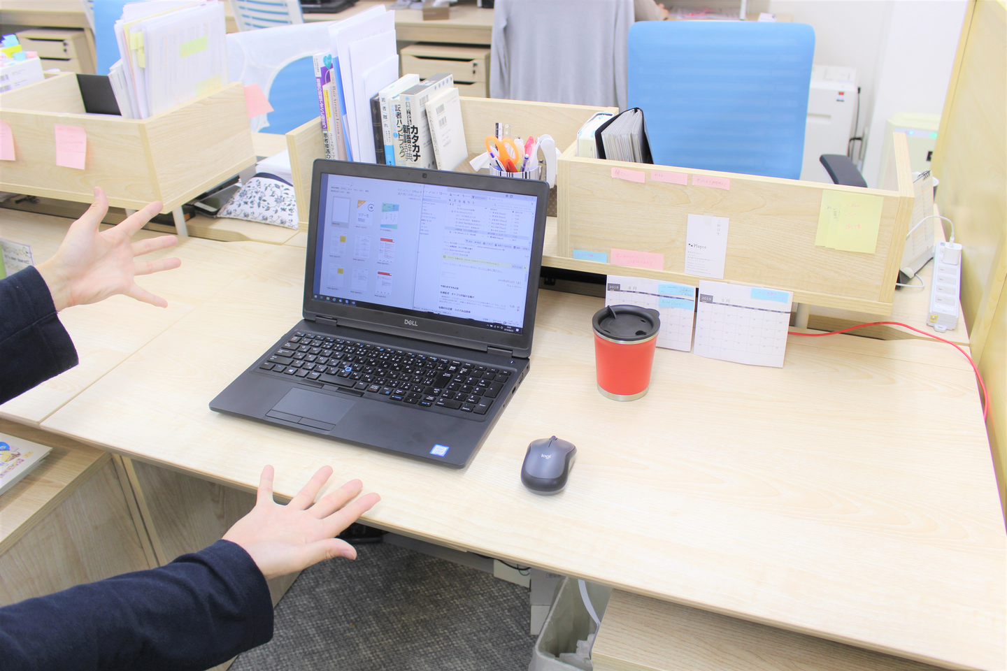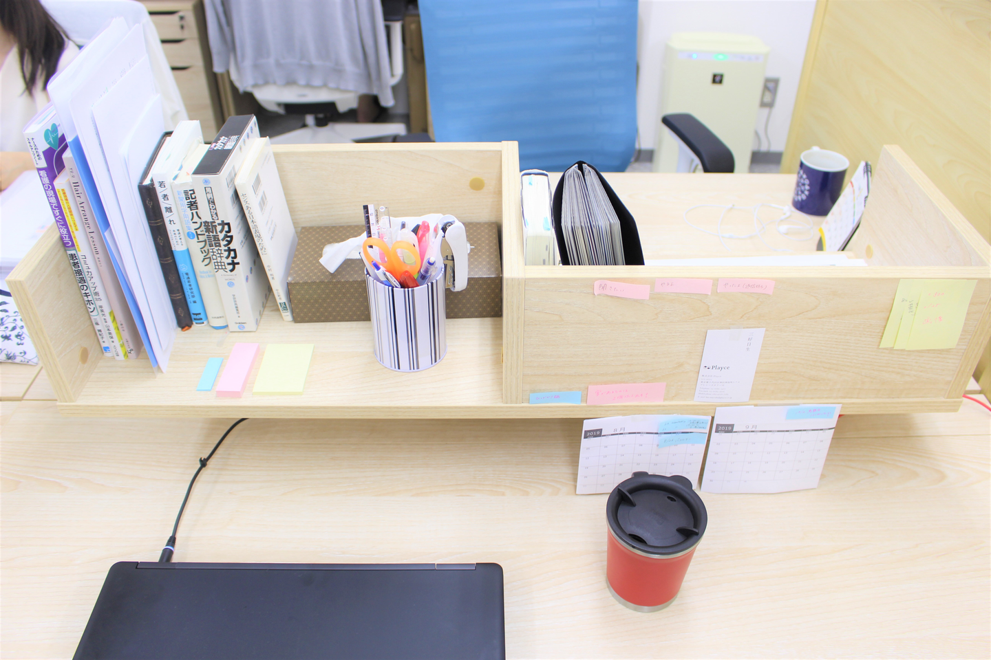 久保「視界は遮らないけど、自分のプライベートな空間は守ってくれる、絶妙な形の収納棚ですね。置いてあるものも社員によってそれぞれで、シンプルにカレンダーを置いている人もいれば、植物を置いておしゃれにしている人もいます」