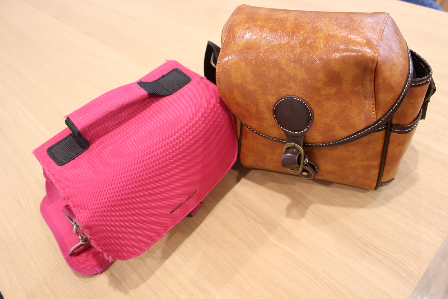Playceには2台のカメラがあり、予約すれば取材などで使用できます。ピンクのカメラバッグはずっと使われているので社員に「ピンクカメラ」と呼ばれていますが、茶色のカメラバッグは最近仲間入りしたので、「ピンクカメラじゃないほう」と呼ばれています (笑)