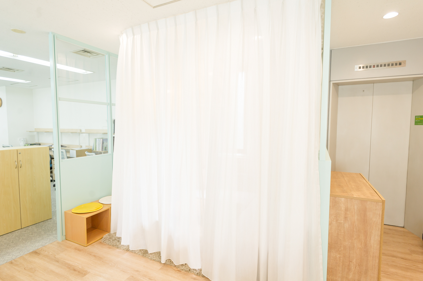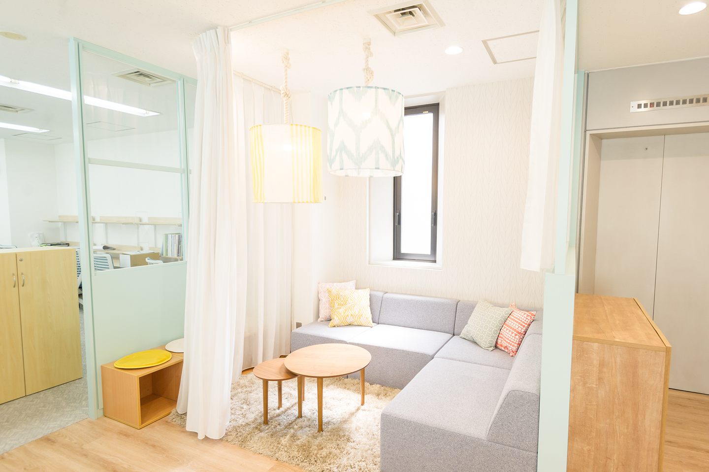 カーテンを閉められるので、一人でこもって集中したい時にも大活躍。仮眠をとる社員や、授乳を行うママさん社員も。ソファスペース以外にもテーブル席やボックス席などさまざまなスペースがあり、打ち合わせや交流の場として、多くの社員が活用しています。