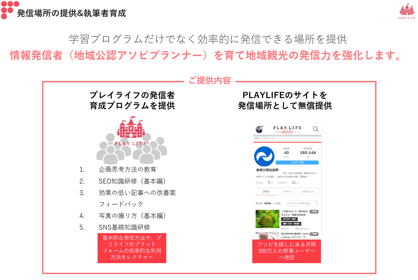 本サービスは、プレイライフで蓄積したノウハウから作成した、オリジナルの学習プログラム(講義形式)の実施と、PLAYLIFEのプラットフォームの無償提供を行うものです。地域の情報発信者(地域公認アソビプランナー)を育てることで、地域自身の発信力強化を支援していきます。