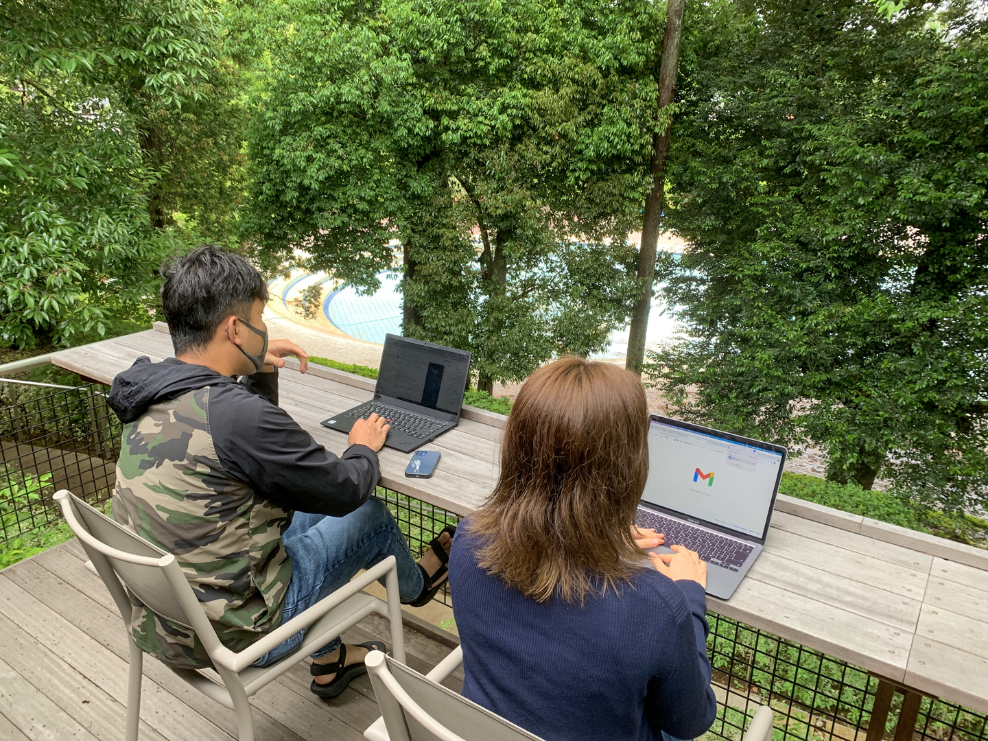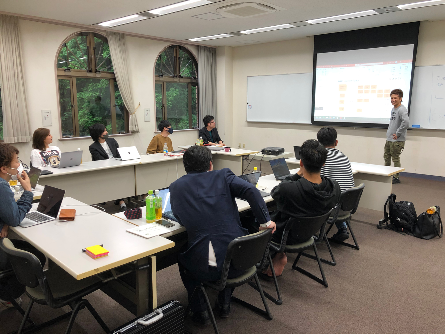 虫や鳥の声が聞こえる会議室であーだこーだ意見を言い合います。