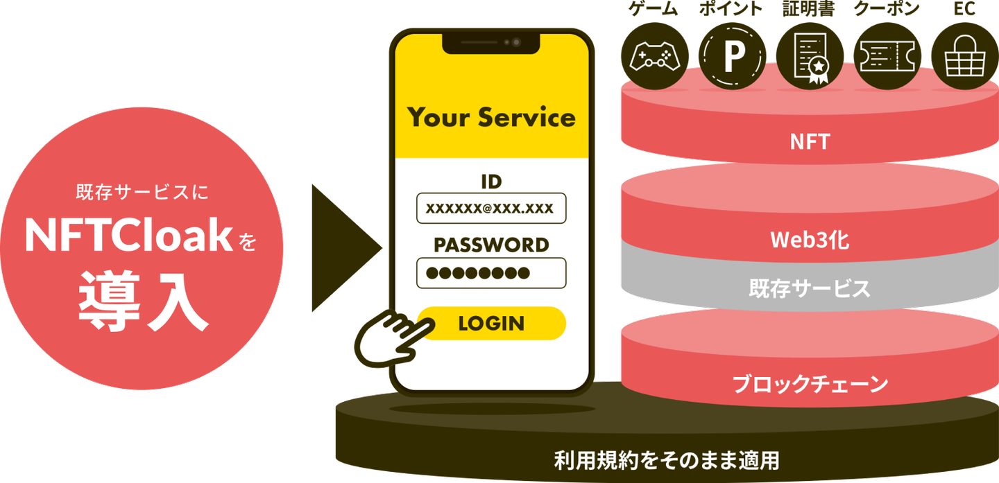 NFTCloakは既存のサービスに導入するだけで、そのサービスの会員基盤にウォレットの情報を紐づけることができます。