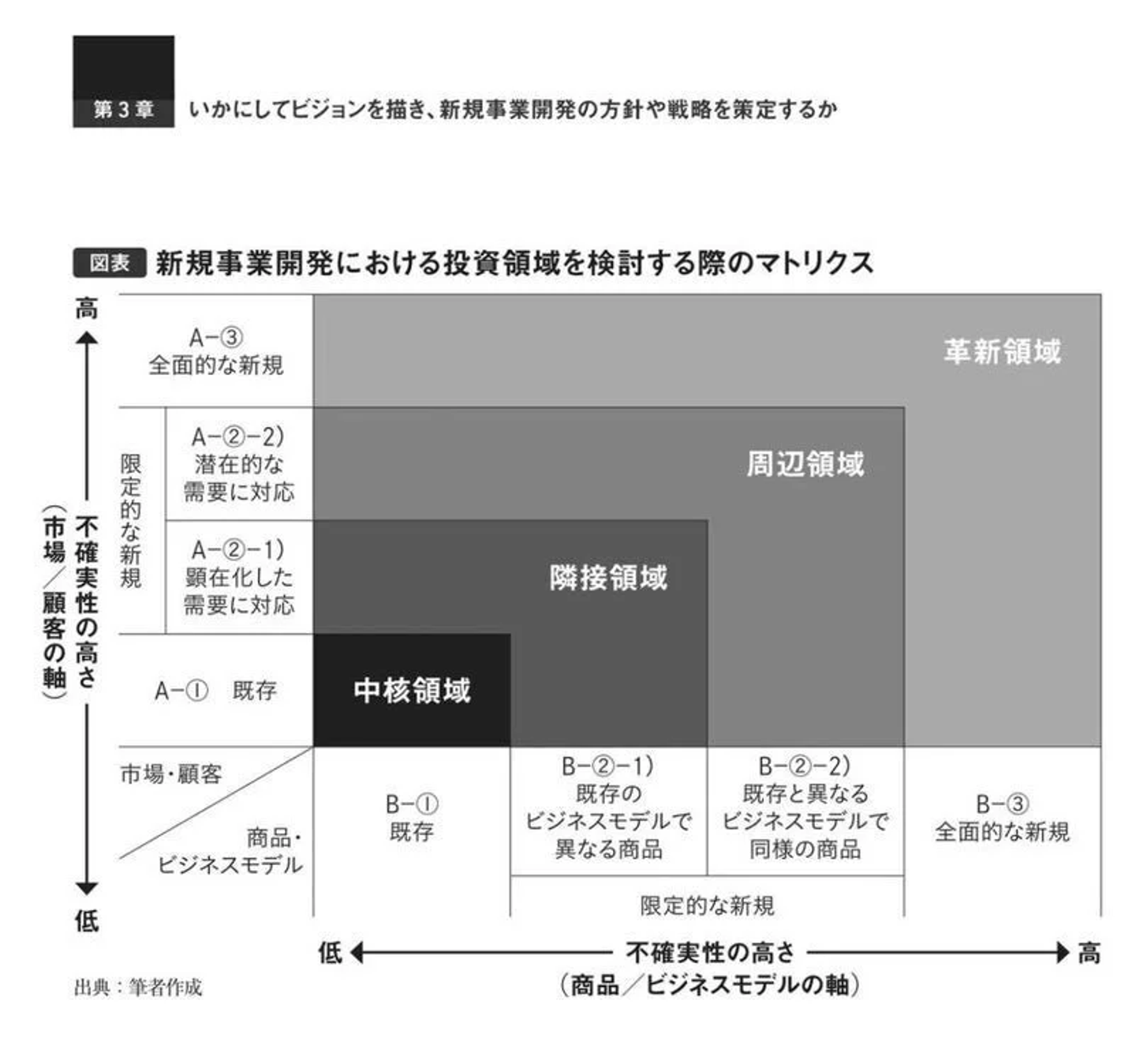 この図では「ビジネスモデル(商品)」と「ビジネス領域(市場)」の2つの軸で、新規事業を位置づけています。