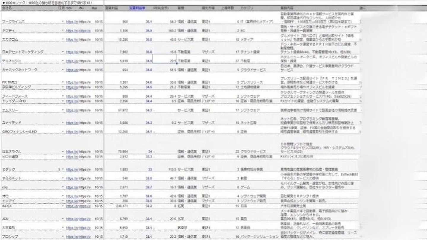 まずは、上場企業約3900社のうち「利益率10%以上」の会社をピックアップしました。当時はだいたい800社ぐらいが該当します。