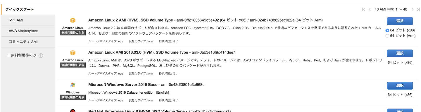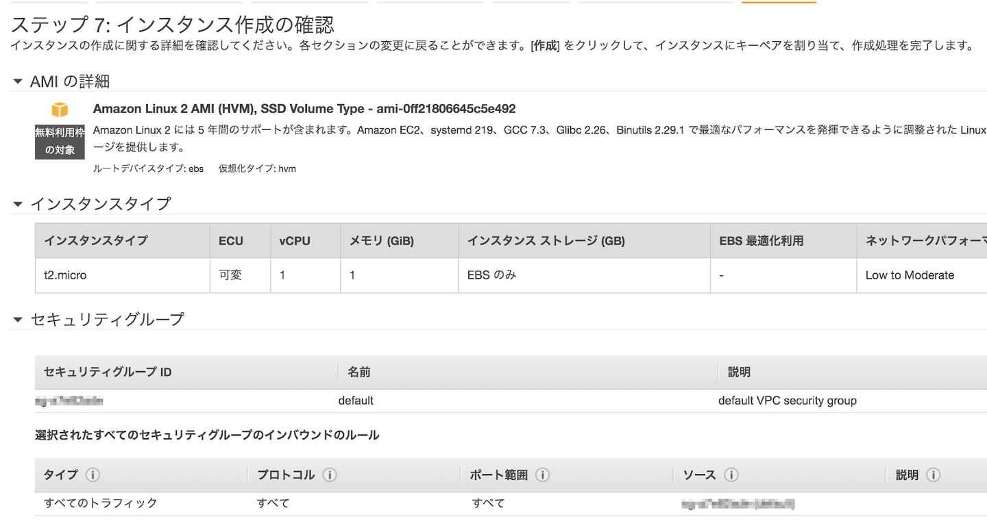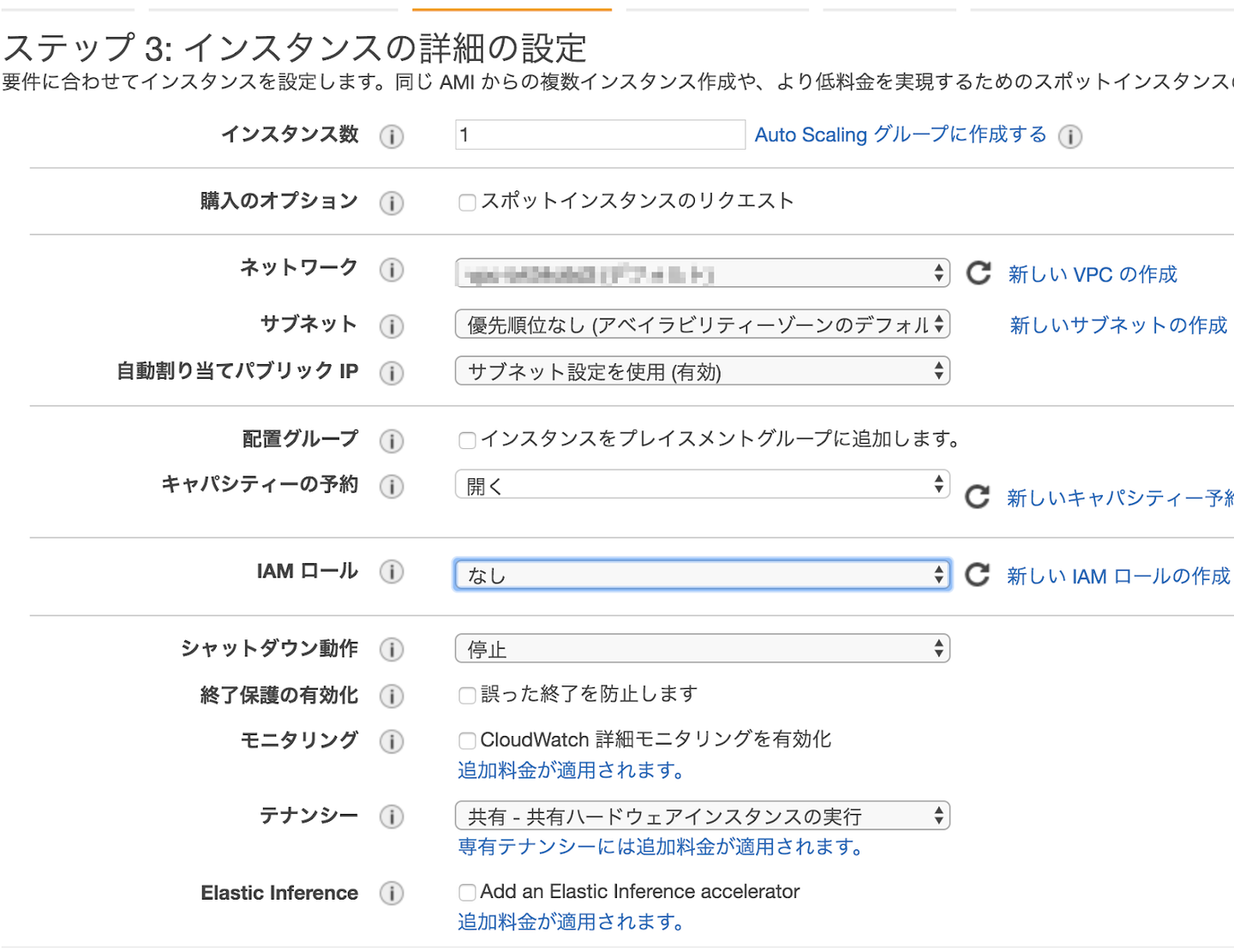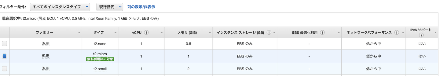 最初の構築時は、t2.microにしておきます。運用してスペック不足であればあげておきます。