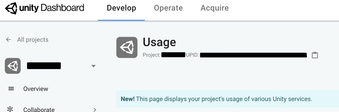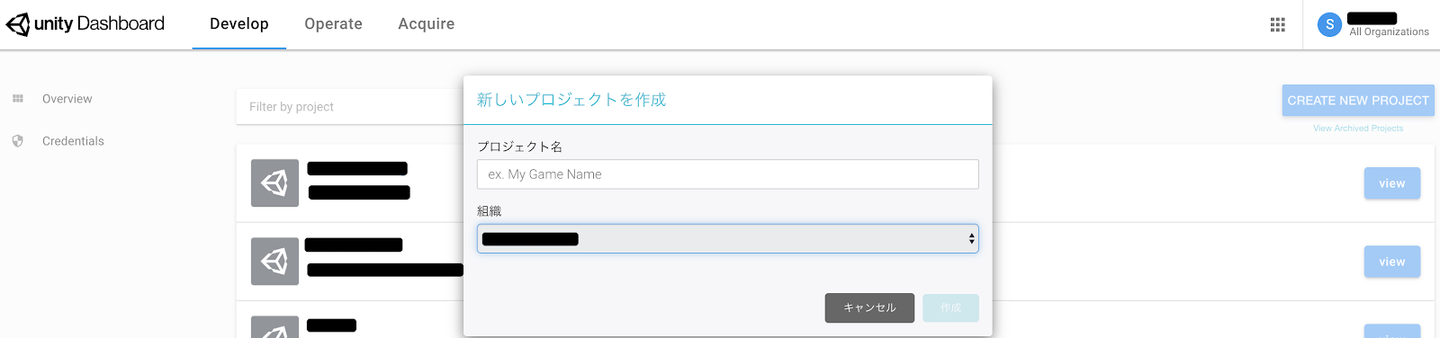 Unity Dashboardの「Develop」タブで新規プロジェクトを作成します。