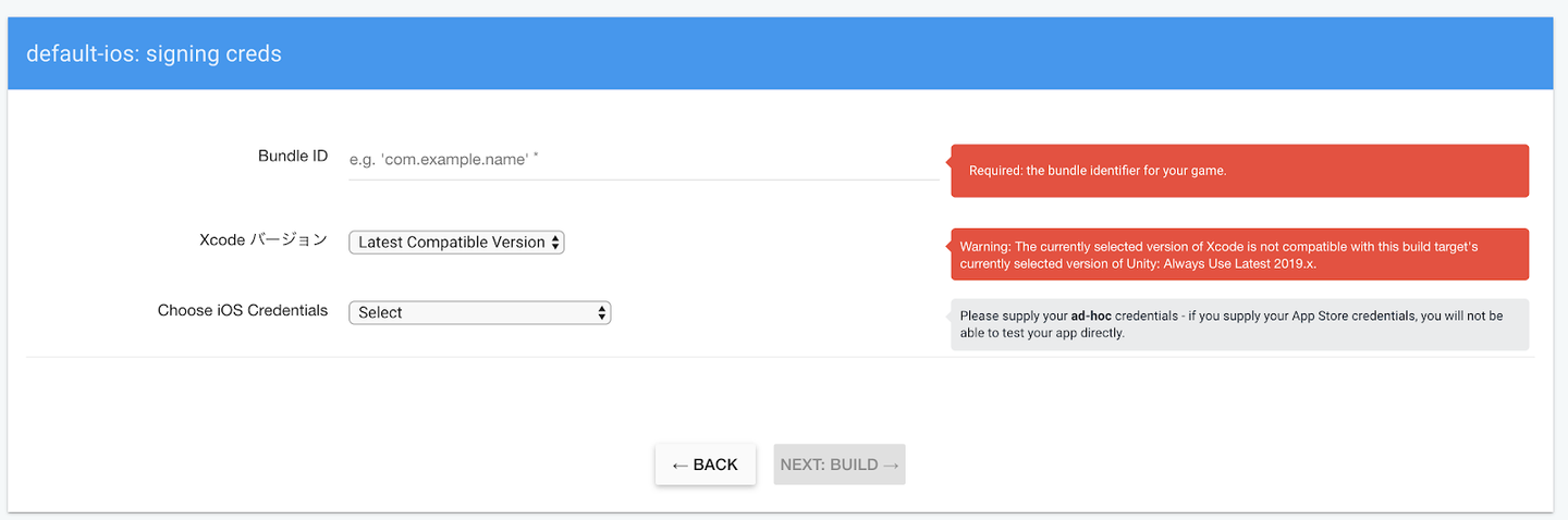 次にBundle ID、Xcodeバージョン(iOSの場合)、provisioningの選択(新規登録)を行います。