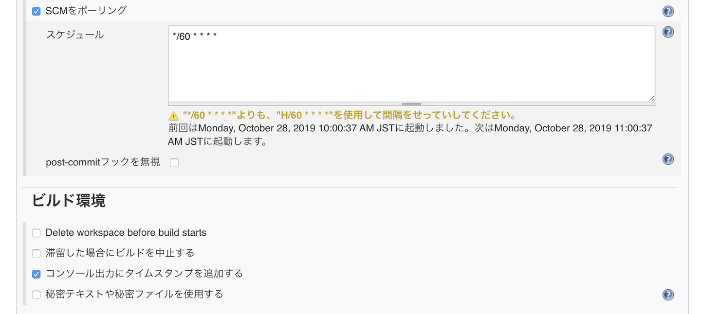 「SCMをポーリング」にチェック入れて、対象ブランチに対して定期的に監視するかを時間設定します。