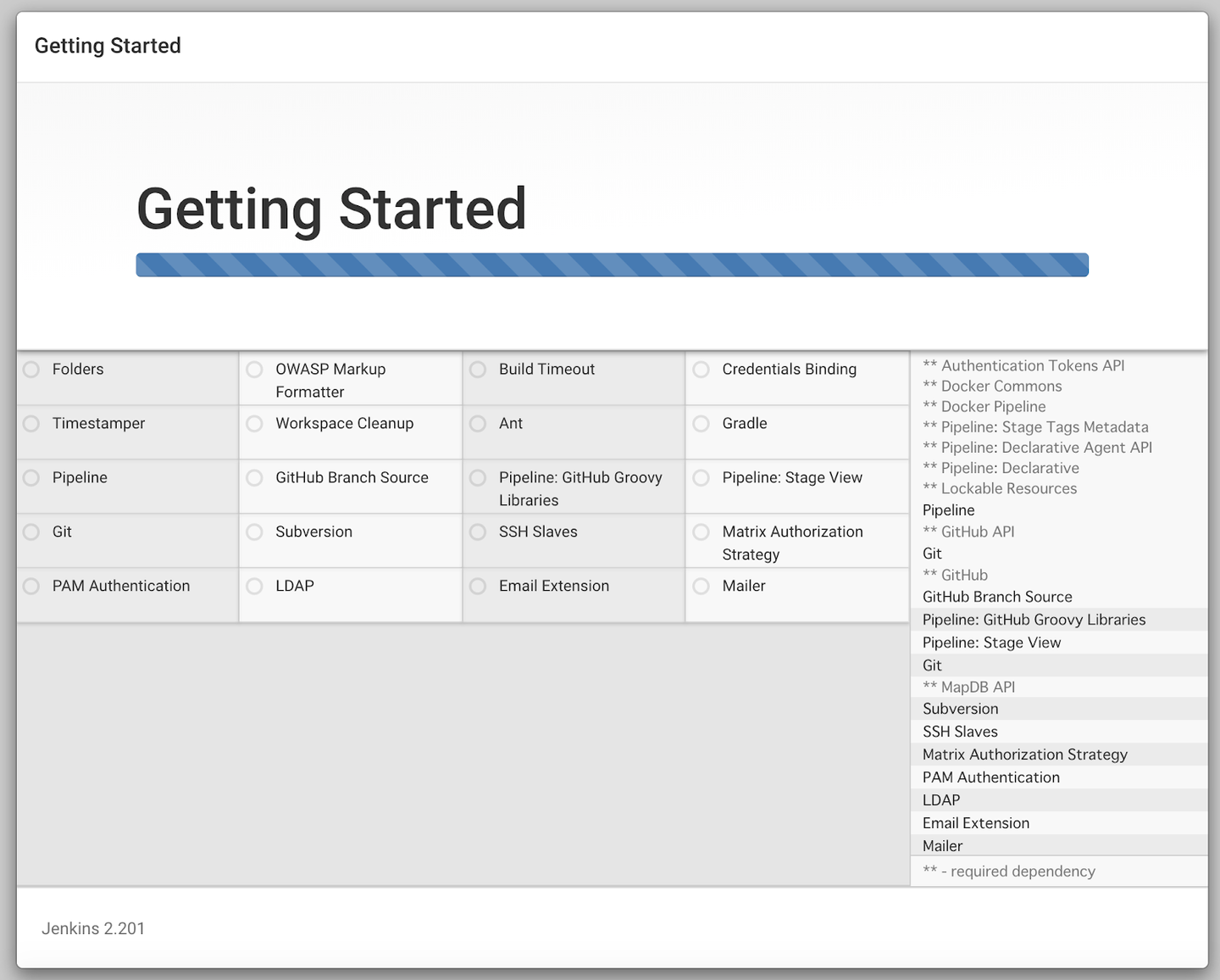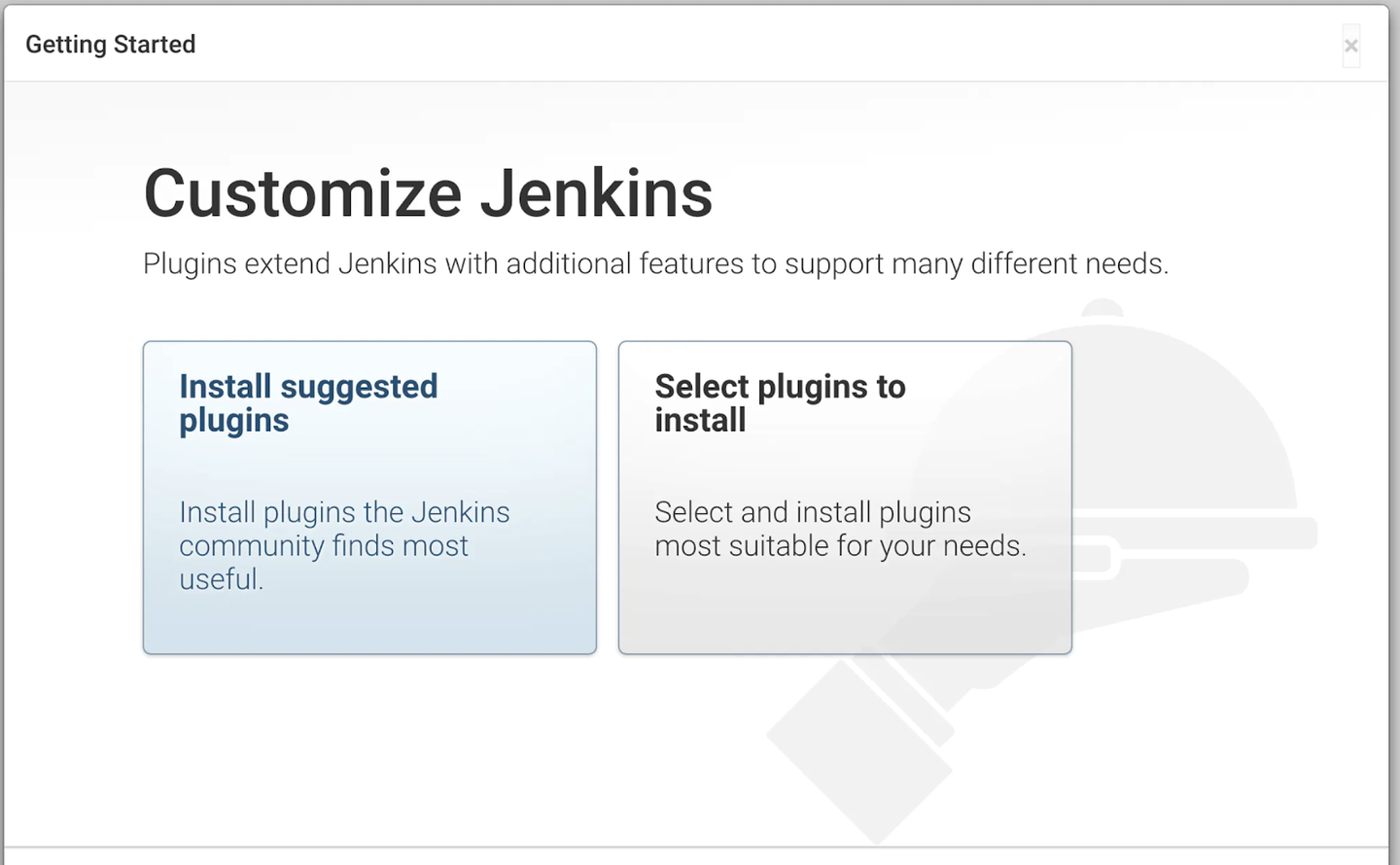 Jenkins-Pluginのインストールです。「Select plugins to install」でデフォルトお勧め設定なっているので、ご自身の環境に合わせて必要なものをインストールします。