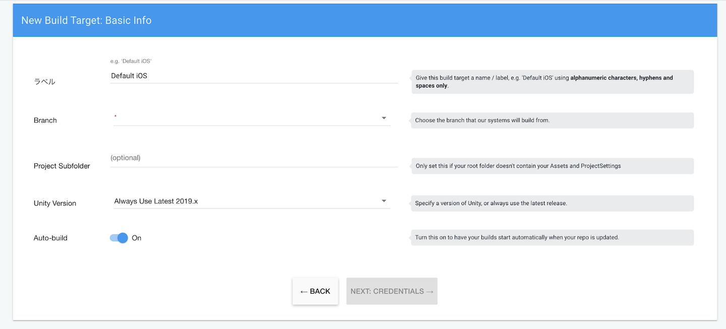 各種設定を入れます。(git branch, サブフォルダ名, Unityバージョン, push後自動ビルド)