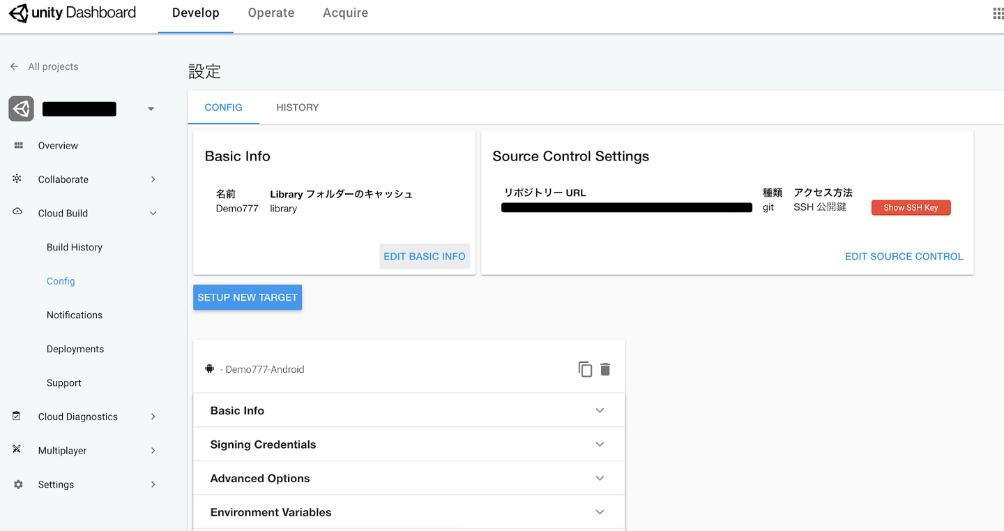 プロジェクト作成後、プロジェクト内の「Cloud Build」 -> 「Config」メニューから、Basic Info、Source Control Settingsを設定します。