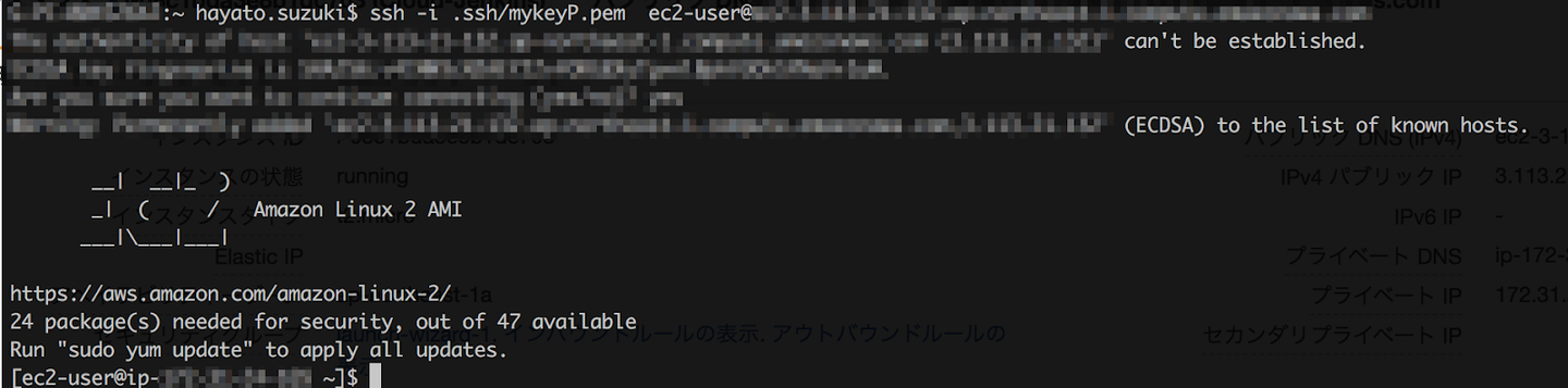 EC2インスタンス作成時に割り当てたキーペアファイル(ここではxxx.pemとする)を使って、ユーザ名「ec2-user」でインスタンスにsshでログインします。
