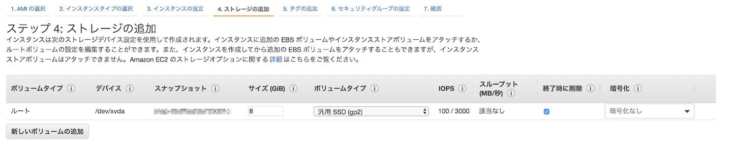 ストレージは最初デフォルトの8Gにしています。Jenkinsインストールまでは全容量2G程度です。運用の状況に応じてEBSの拡張します。