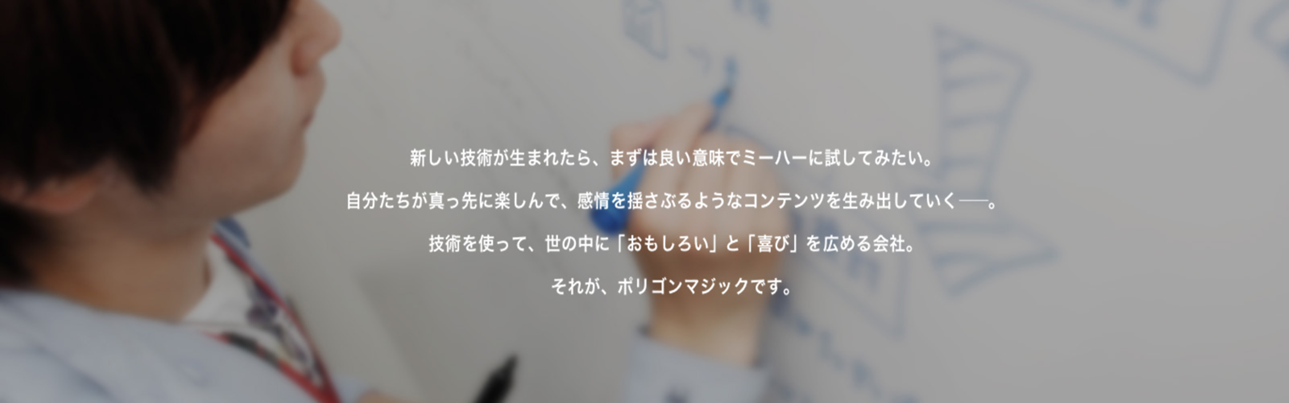 ポリゴンマジックは1996に生まれたデジタルエンタテイメント企業で、「笑顔の創造」をミッションに、1人でも多くのユーザーを笑顔にするべく日々成長を続けています。 さらにグループとしては、教育事業、ヘルスケア事業、飲食事業など様々な事業を展開しています。