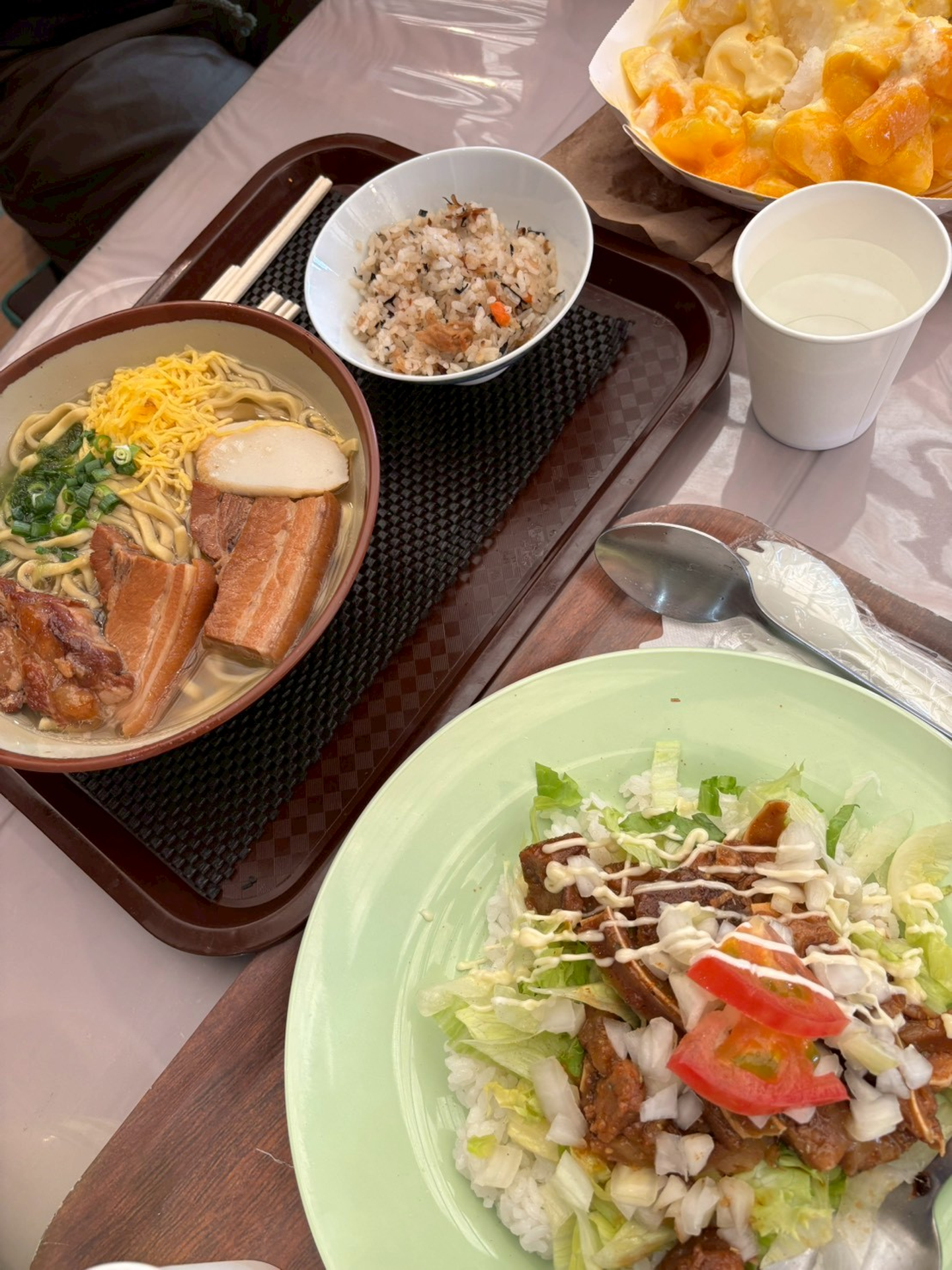 奥から、マンゴーかき氷、ジューシー、沖縄そば、タコライスです🐙