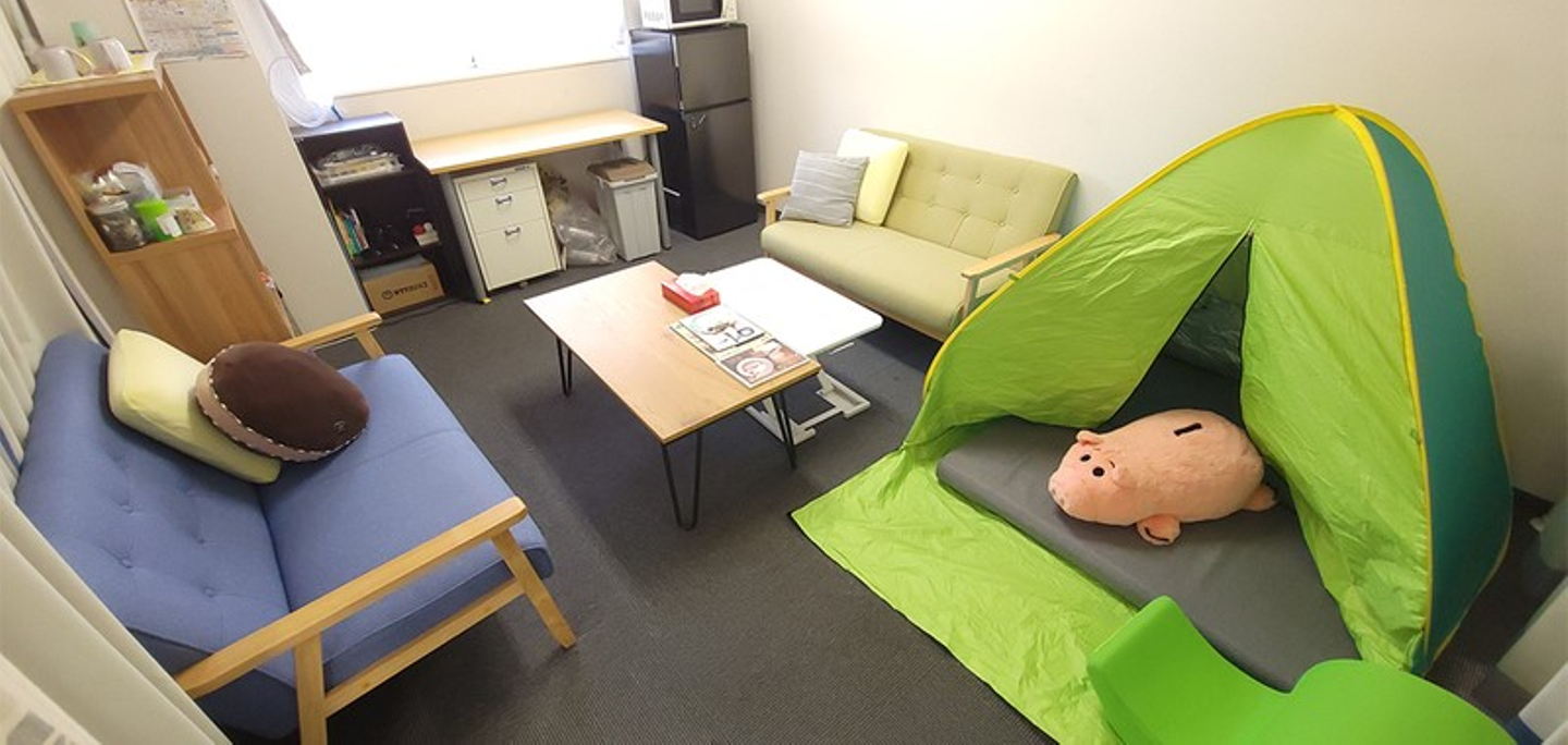 ワークスペースの一角、カーテンで仕切られたエリアには冷蔵庫・電子レンジ・電気ケトル・ネスカフェ ドルチェグストがあり、休憩スペースとして利用しています。